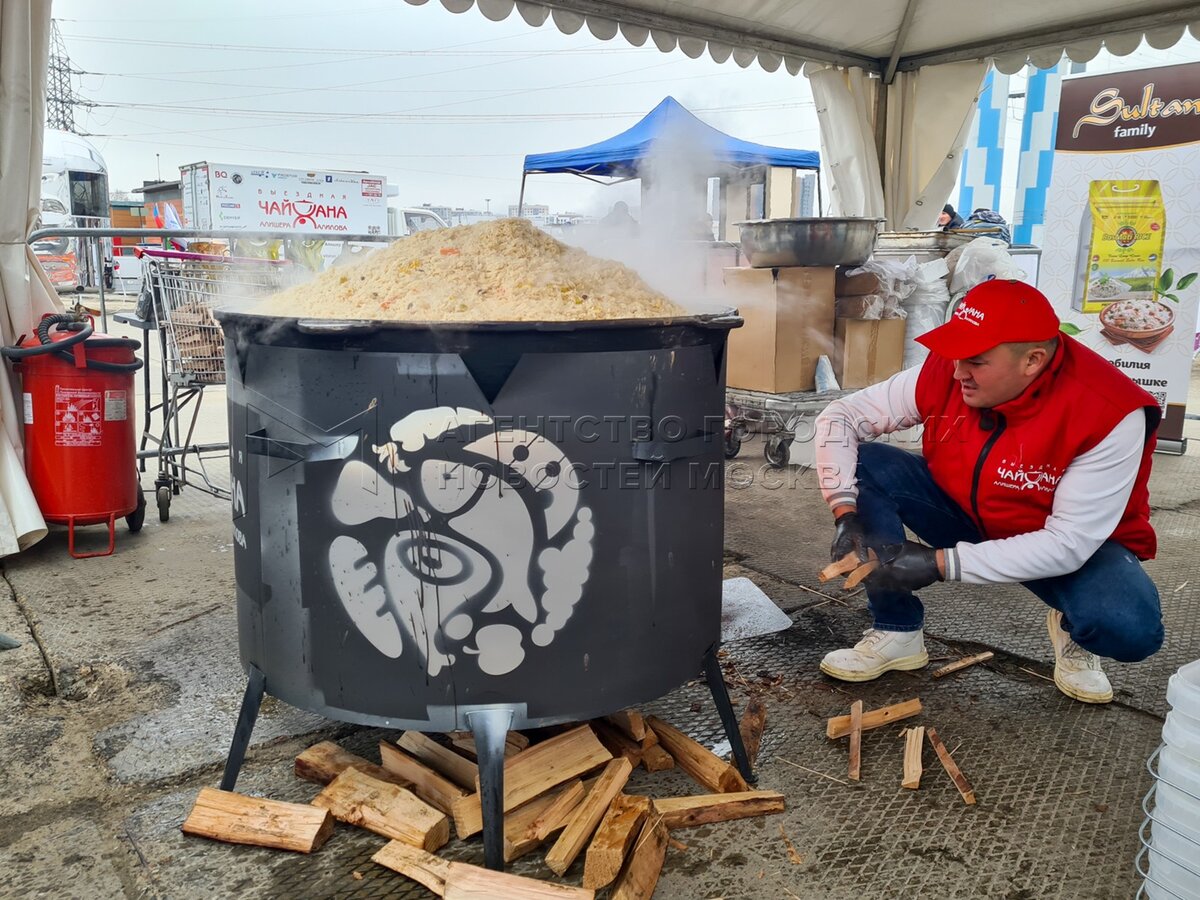 Повар, блогер, владелец чайханы Алишер Халилов во время благотворительной акции «Самый большой плов, приготовленный одним поваром» на территории оптово-розничного продовольственного центра «Фуд Сити».