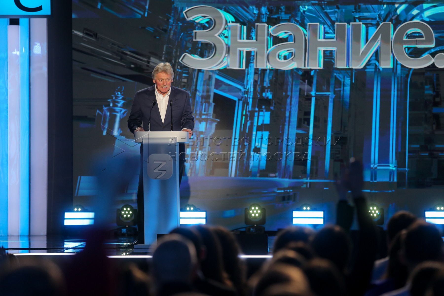 - Описание: Пресс-секретарь президента России Дмитрий Песков во время старта просветительского марафона «Знание.Первые» Российского общества «Знание» в рамках международной выставки-форума «Россия» на территории ВДНХ.