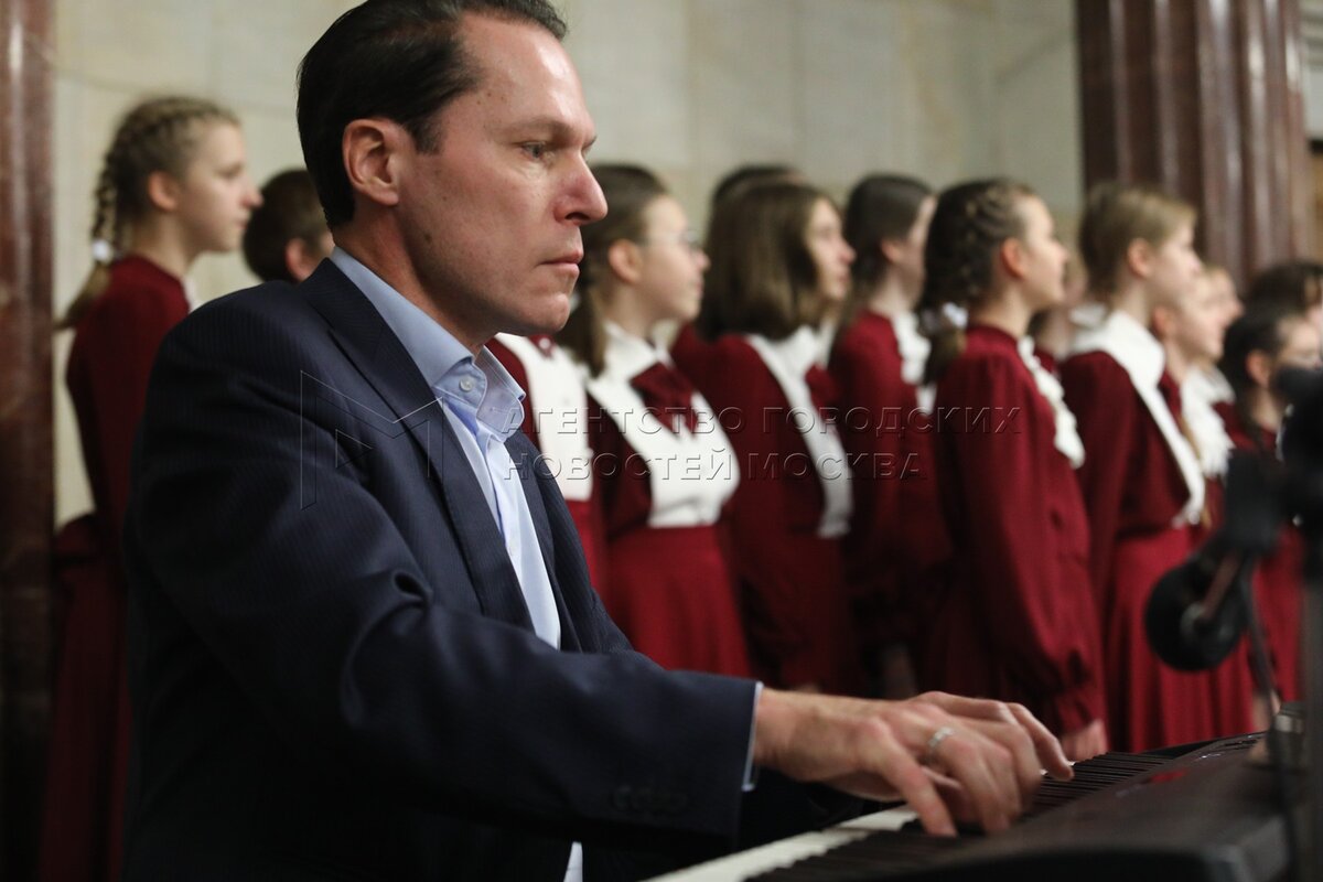 Аккомпаниатор во время выступления Большого детского хора в аванзале станции метр...