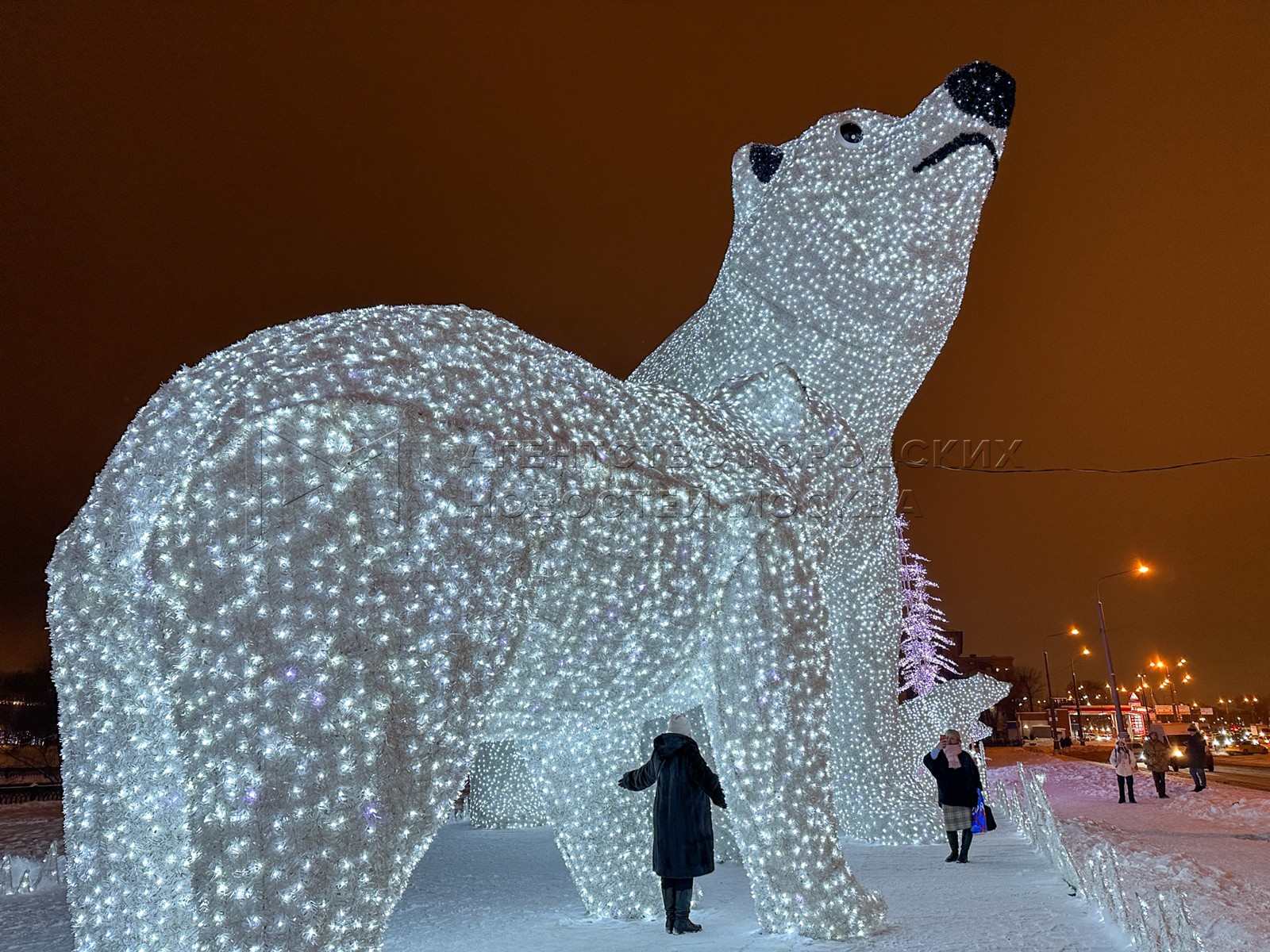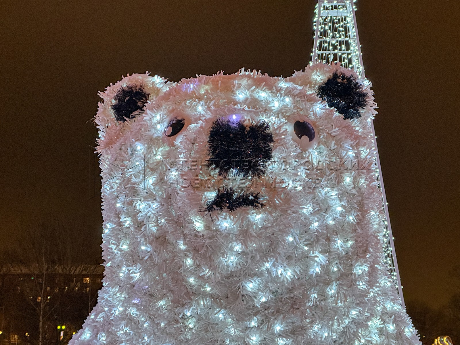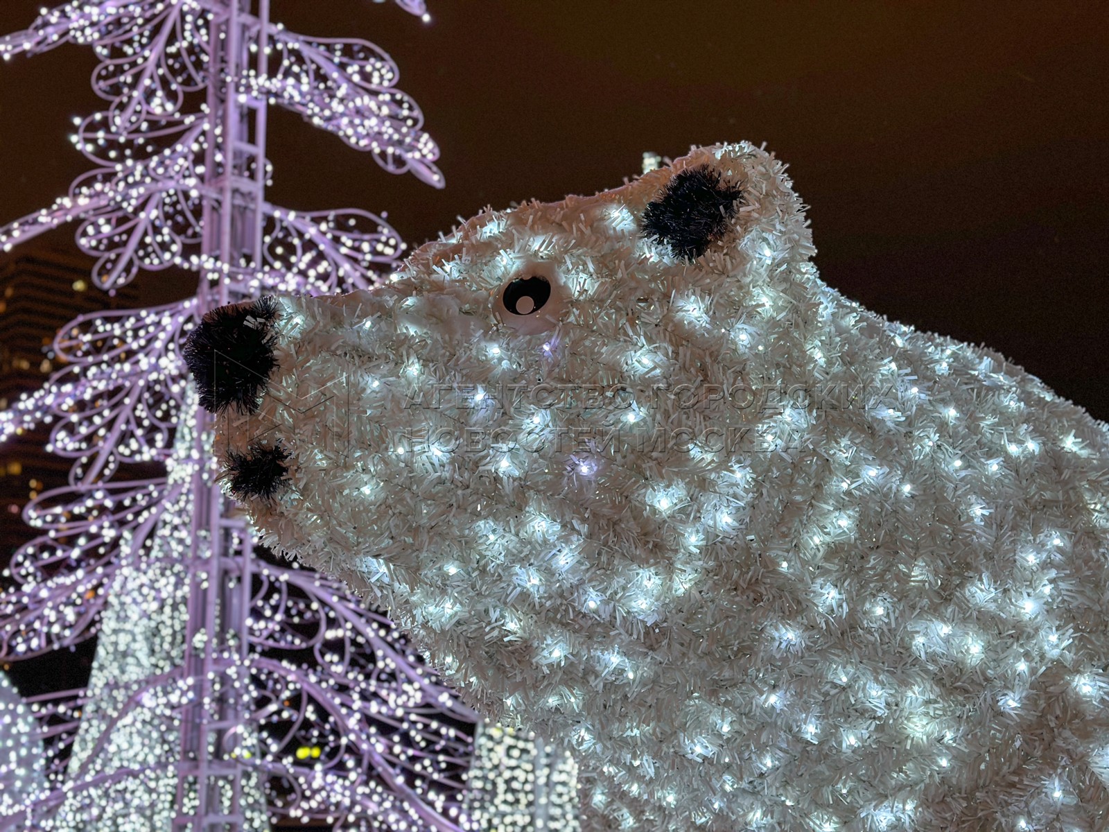Новогодняя елка и светодиодные инсталляции в виде полярных медведей и падающих зв...