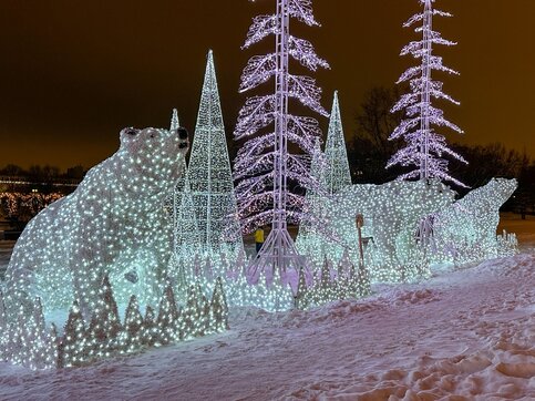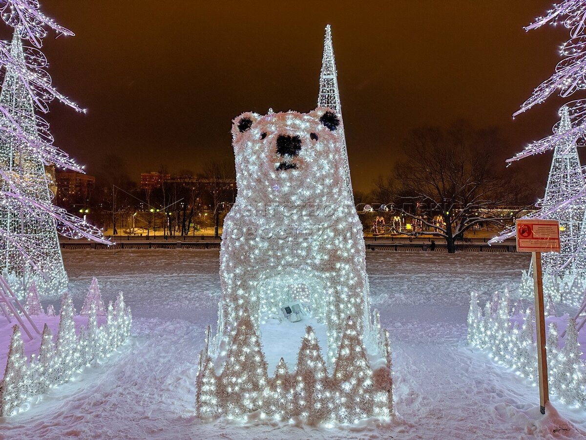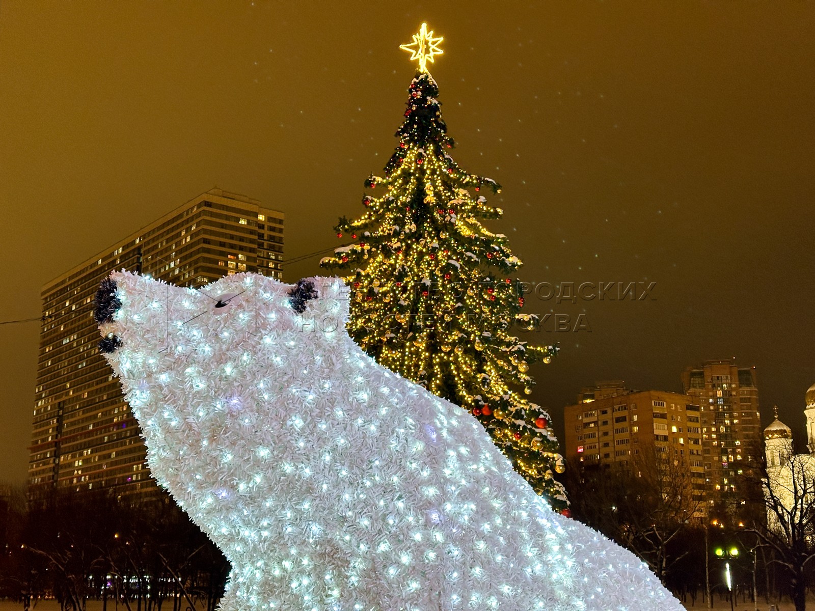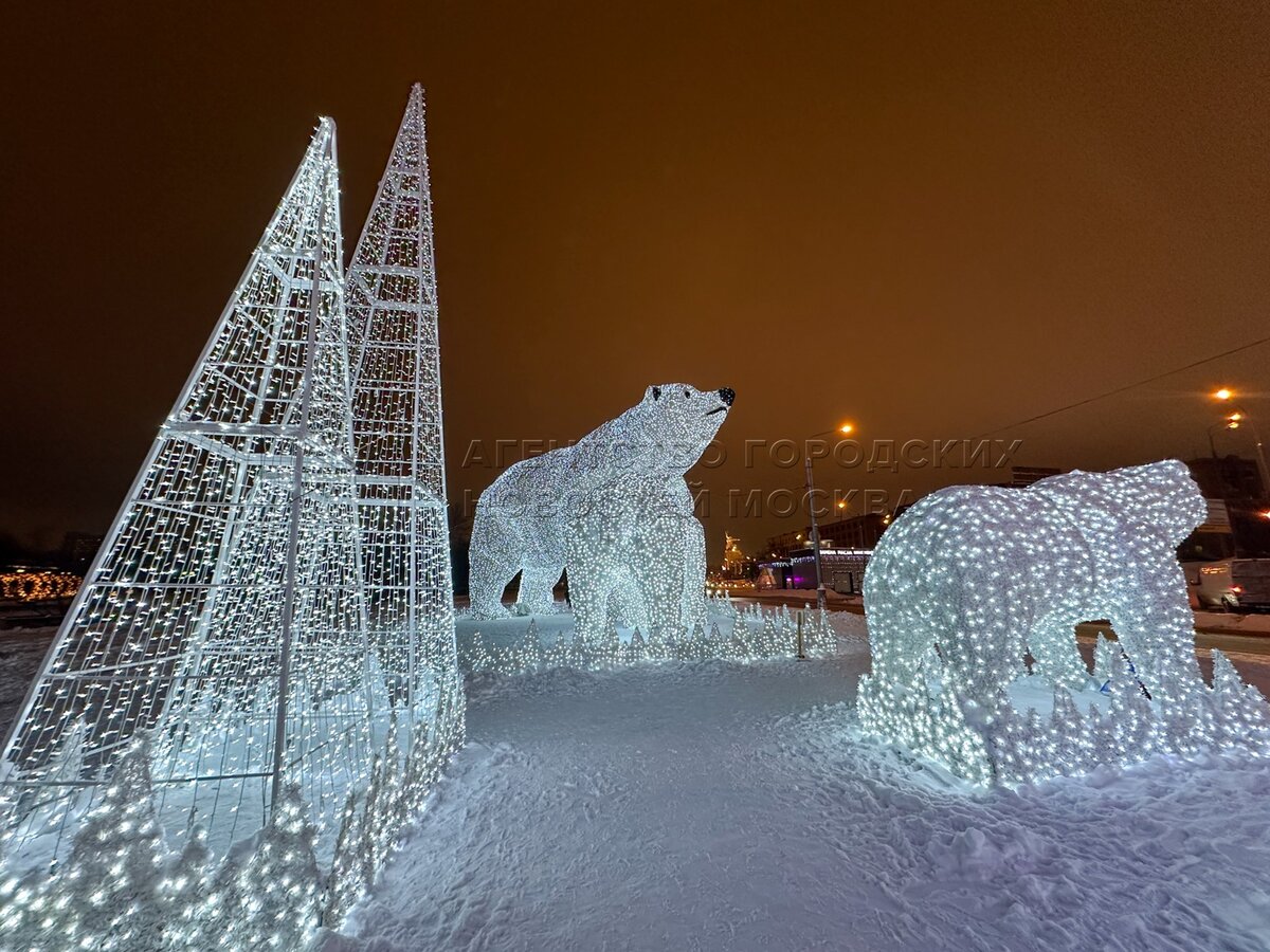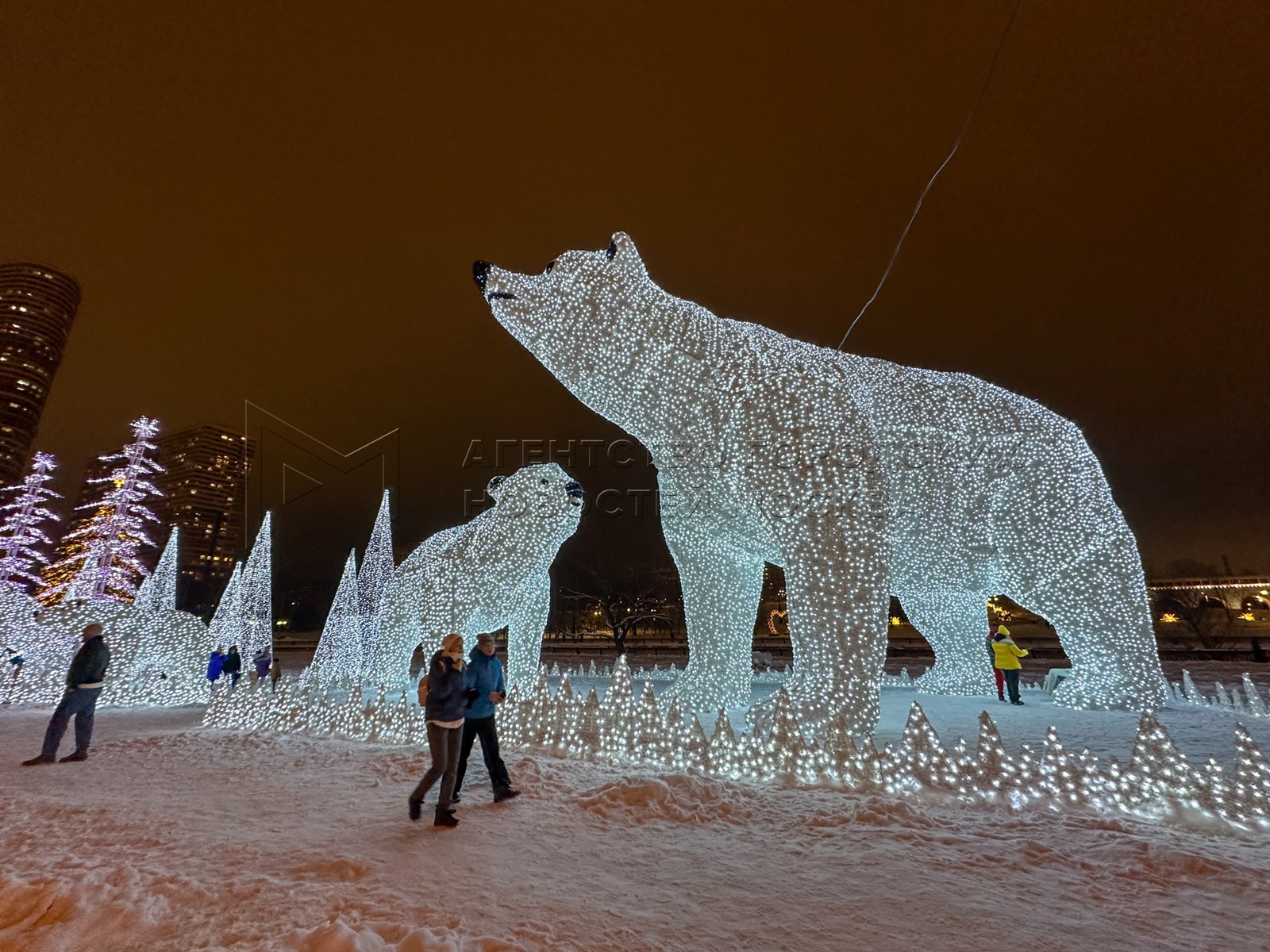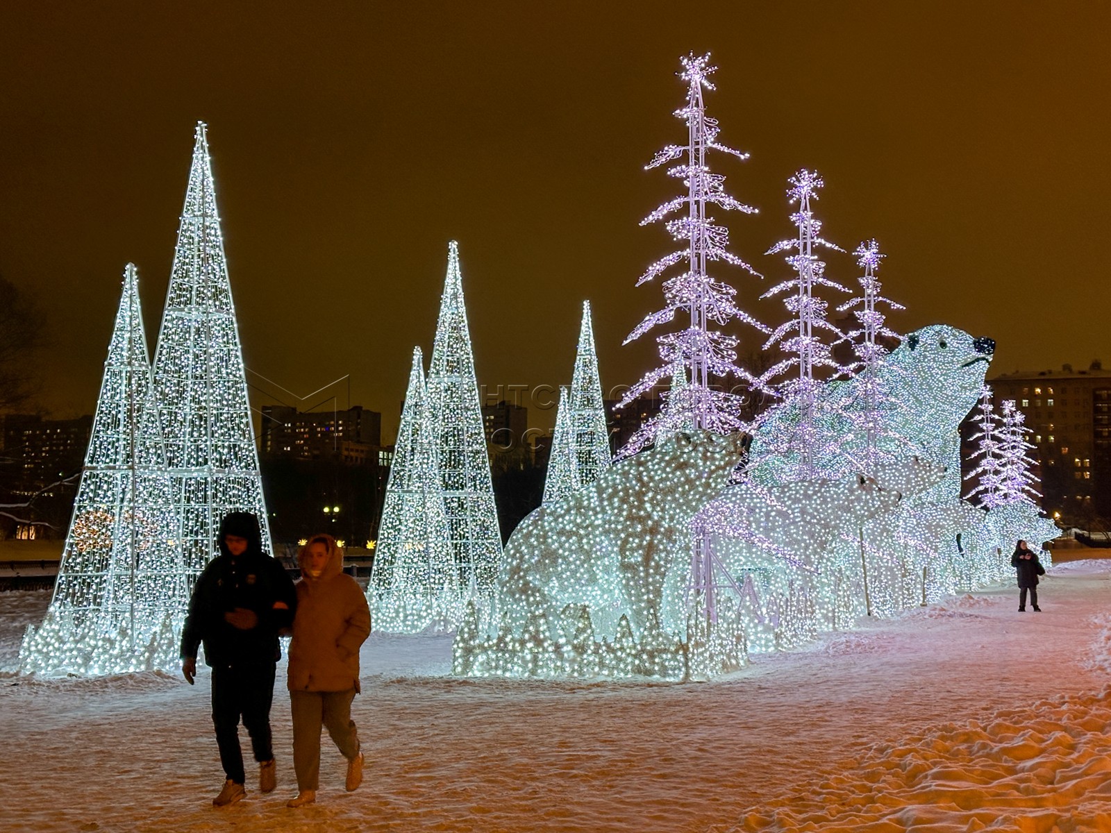 • Описание: Новогодняя елка и светодиодные инсталляции в виде полярных медведей и падающих звезд в парке возле Ростокинского акведука на северо-востоке Москвы.