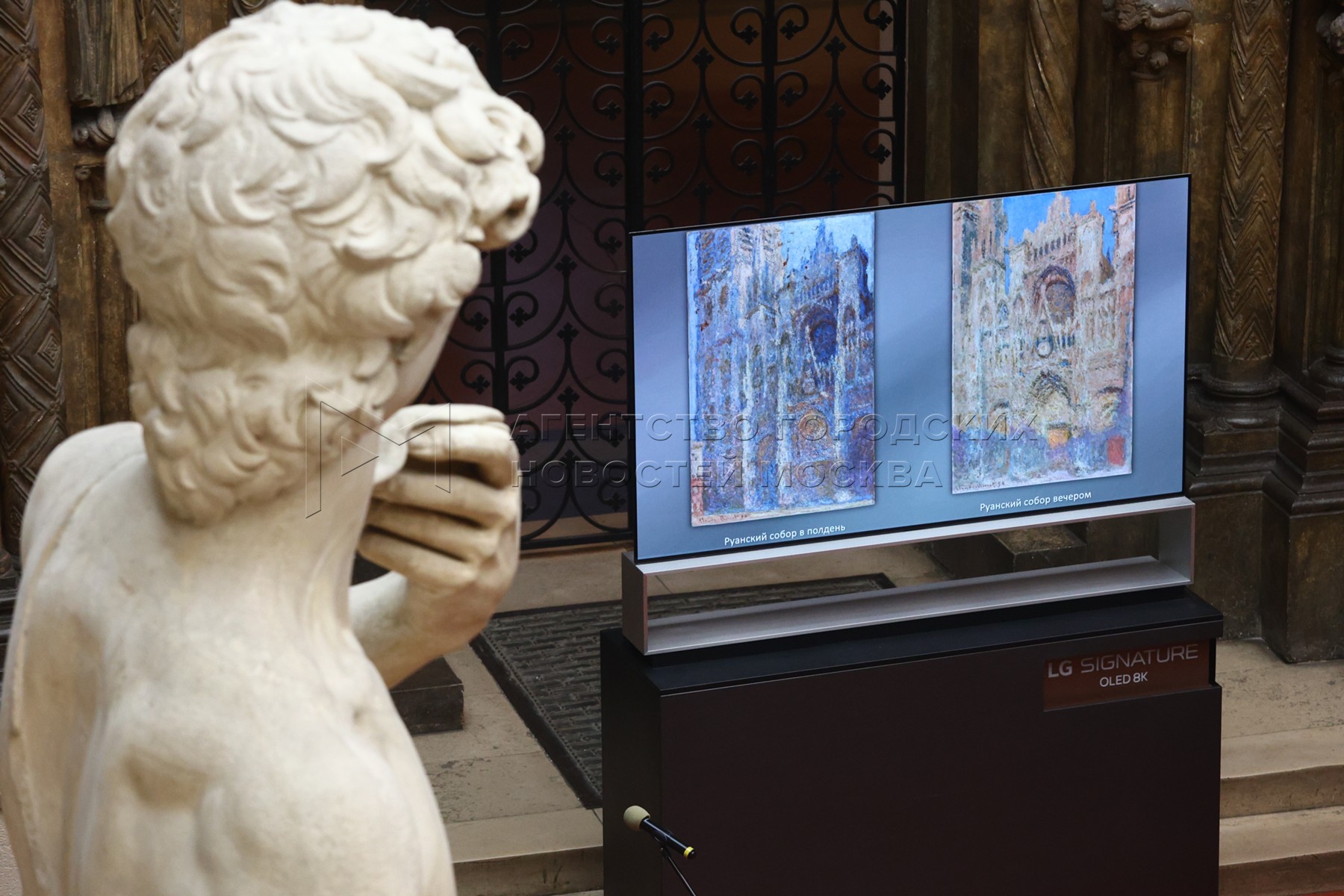 • Описание: Мраморная статуя (копия) работы Микеланджело Буонарроти «Давид» (1501-1504 гг.) в зале «Итальянский дворик». Презентация результатов исследовательского проекта «Руанские соборы» Моне» в Государственном музее изобразительных искусств имени Пушкина.