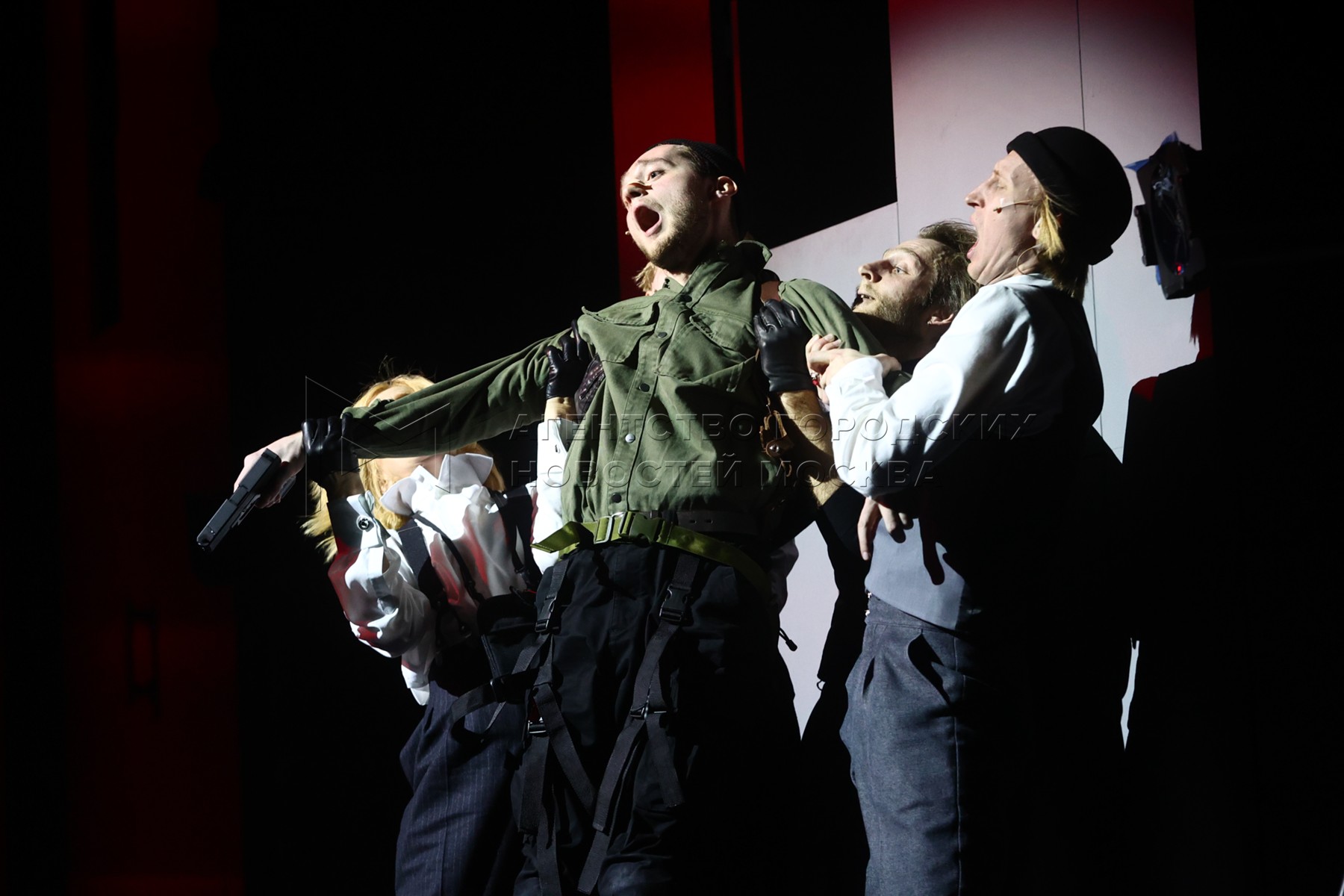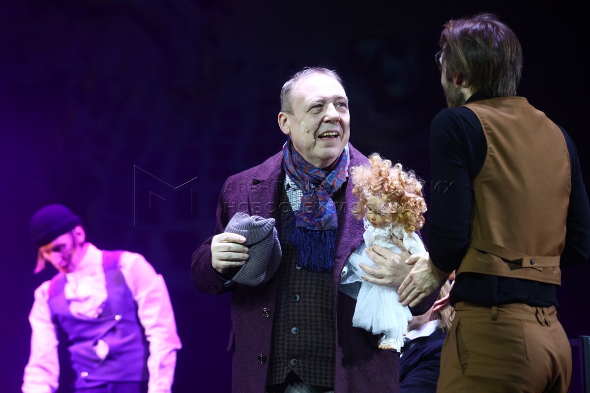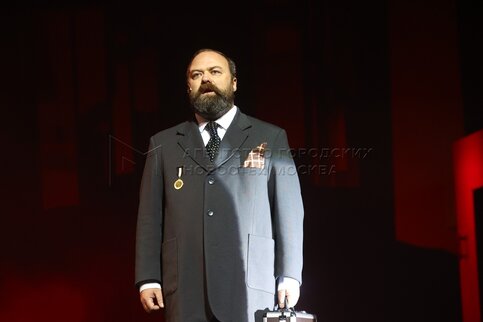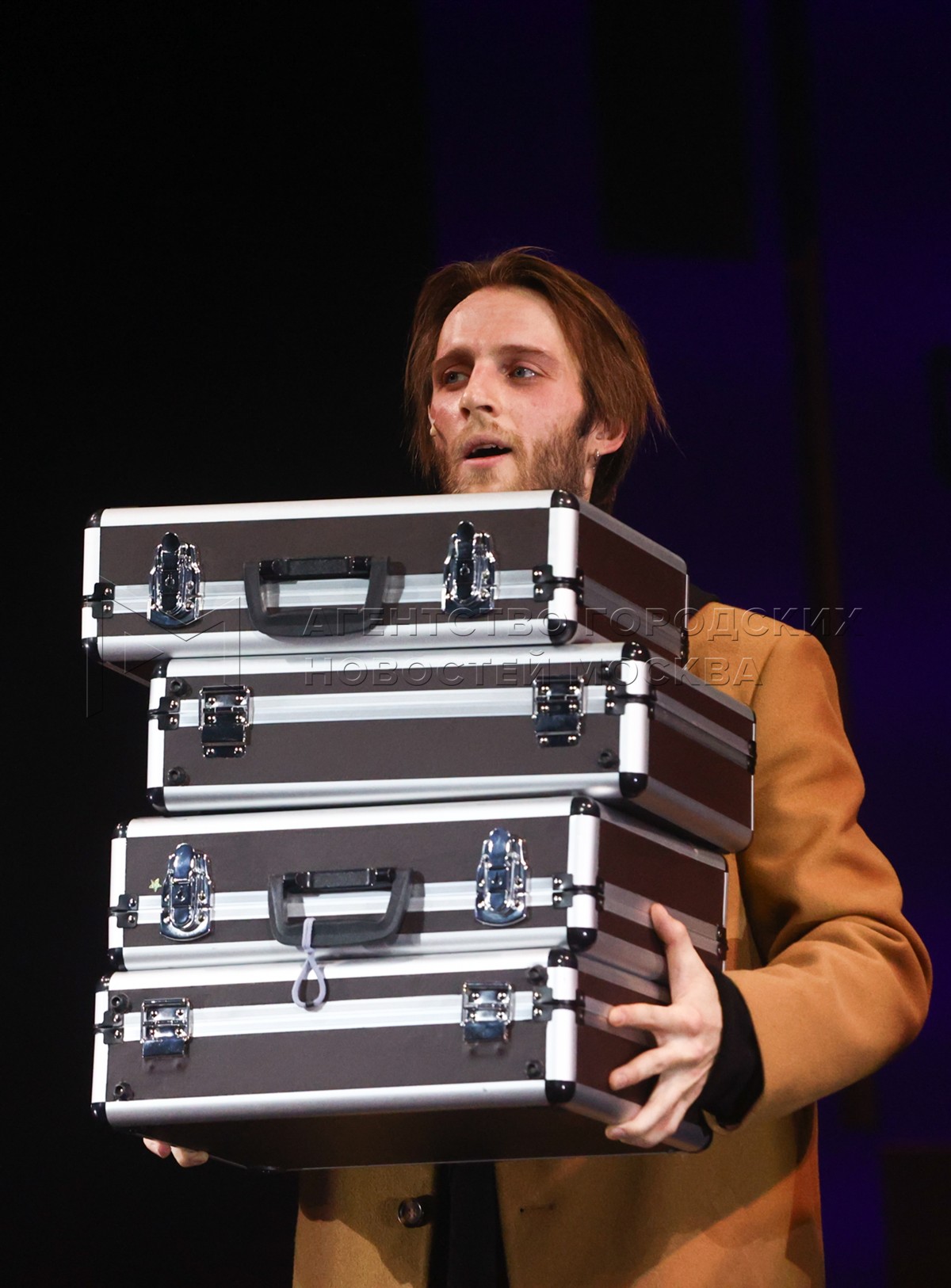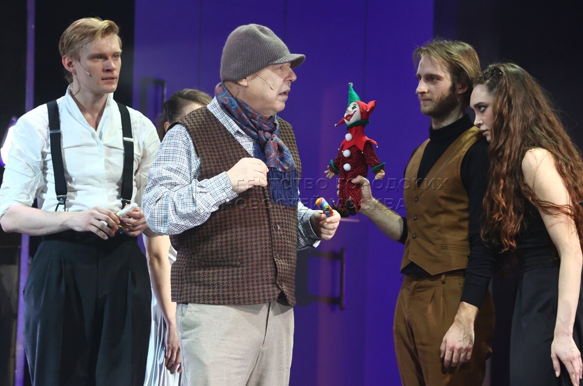 • Описание: Актер Марк Бурлай в роли Ихарева (в центре) во время показа премьеры «Игроки. Иллюзия» в Театре имени Гоголя.