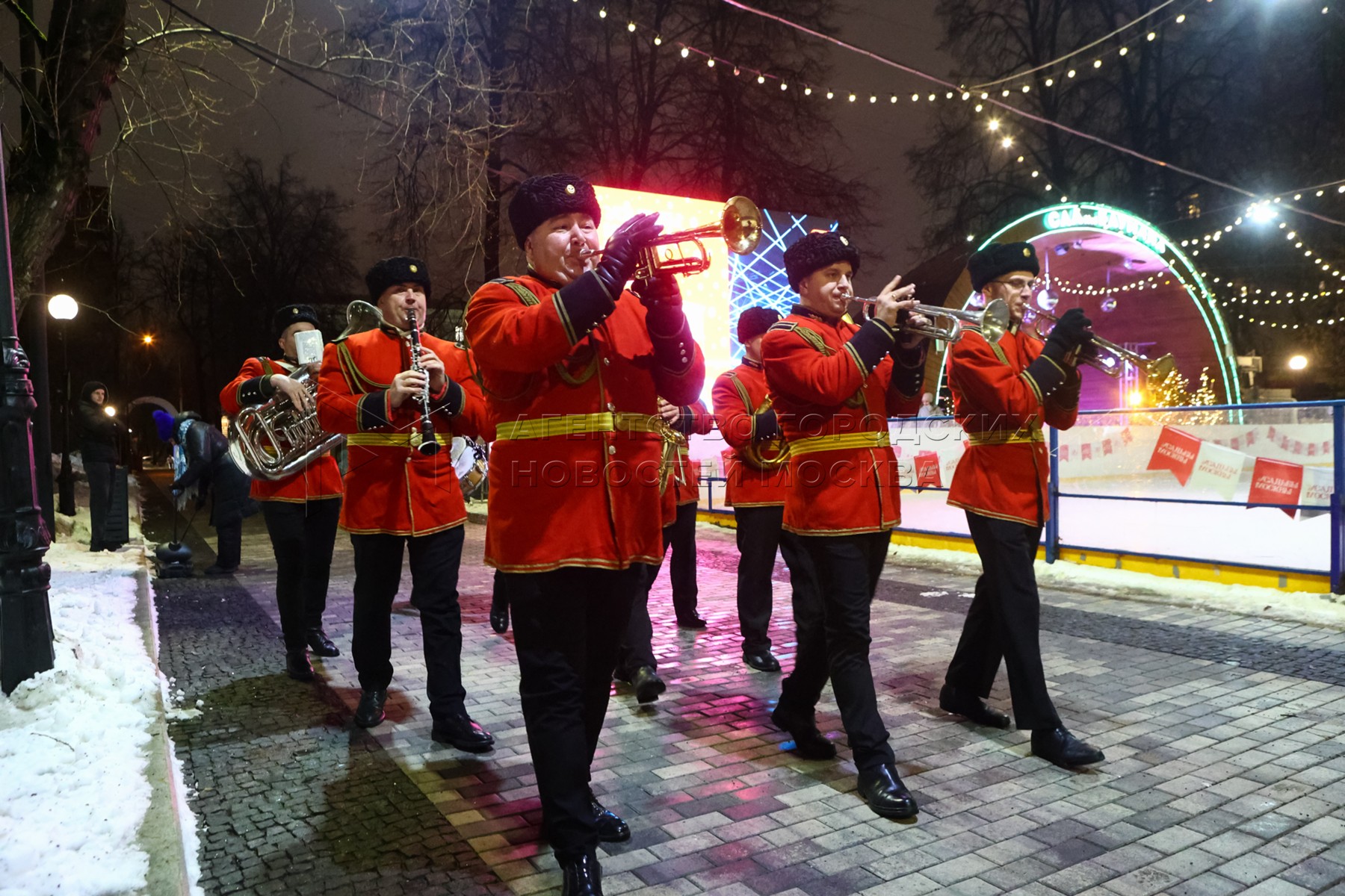 Духовой оркестр в исторических костюмах на фестивале «Усадьбы Москвы. Зима» в сад...
