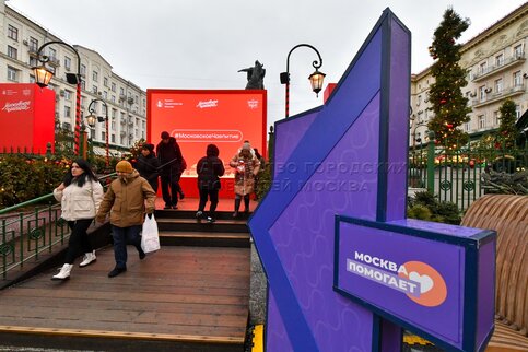 Шале «Москва помогает» на площадке городского фестиваля «Путешествие в Рождество» на Манежной площади.