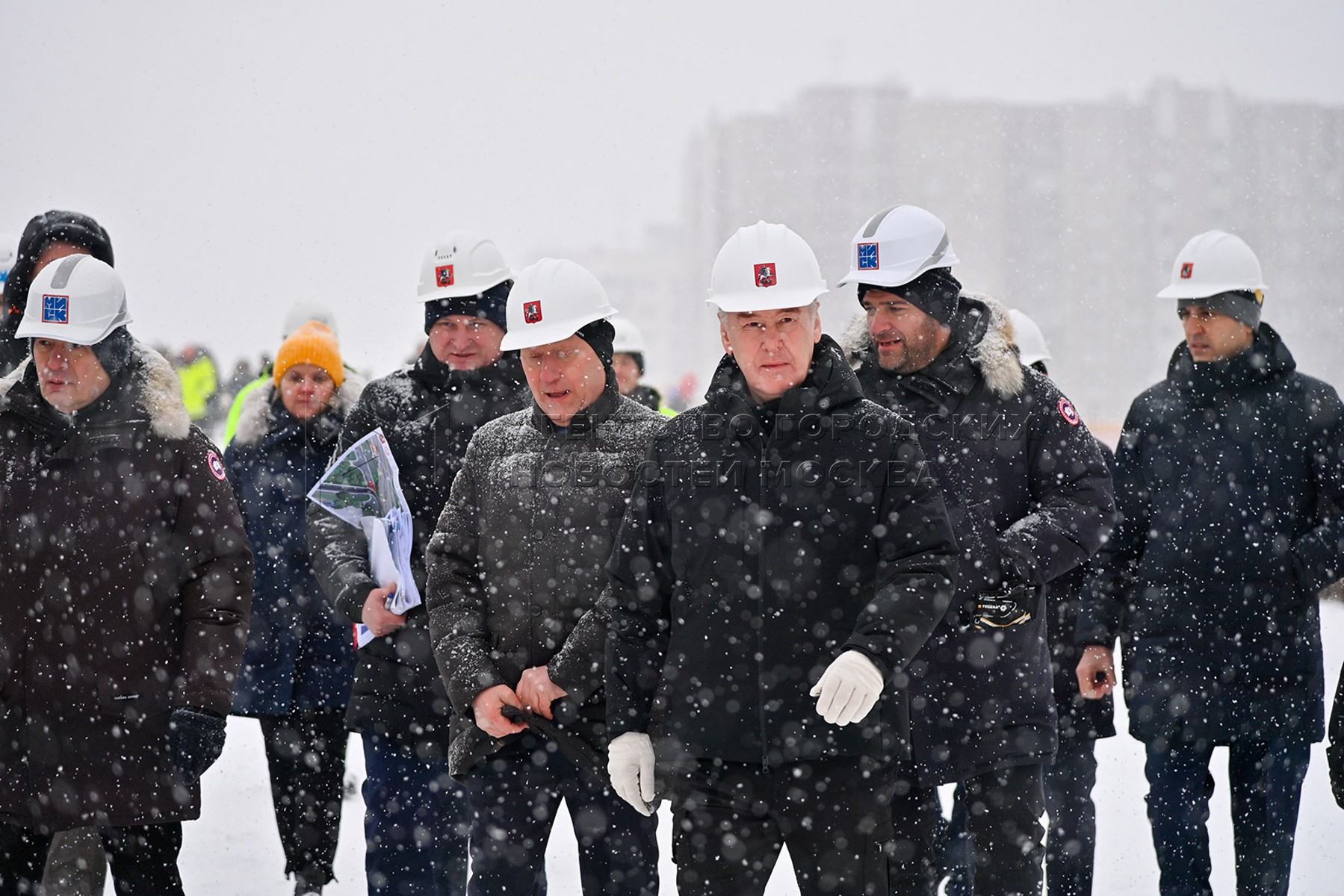 Мэр Москвы Сергей Собянин (в центре) во время осмотра строящегося путепровода чер...