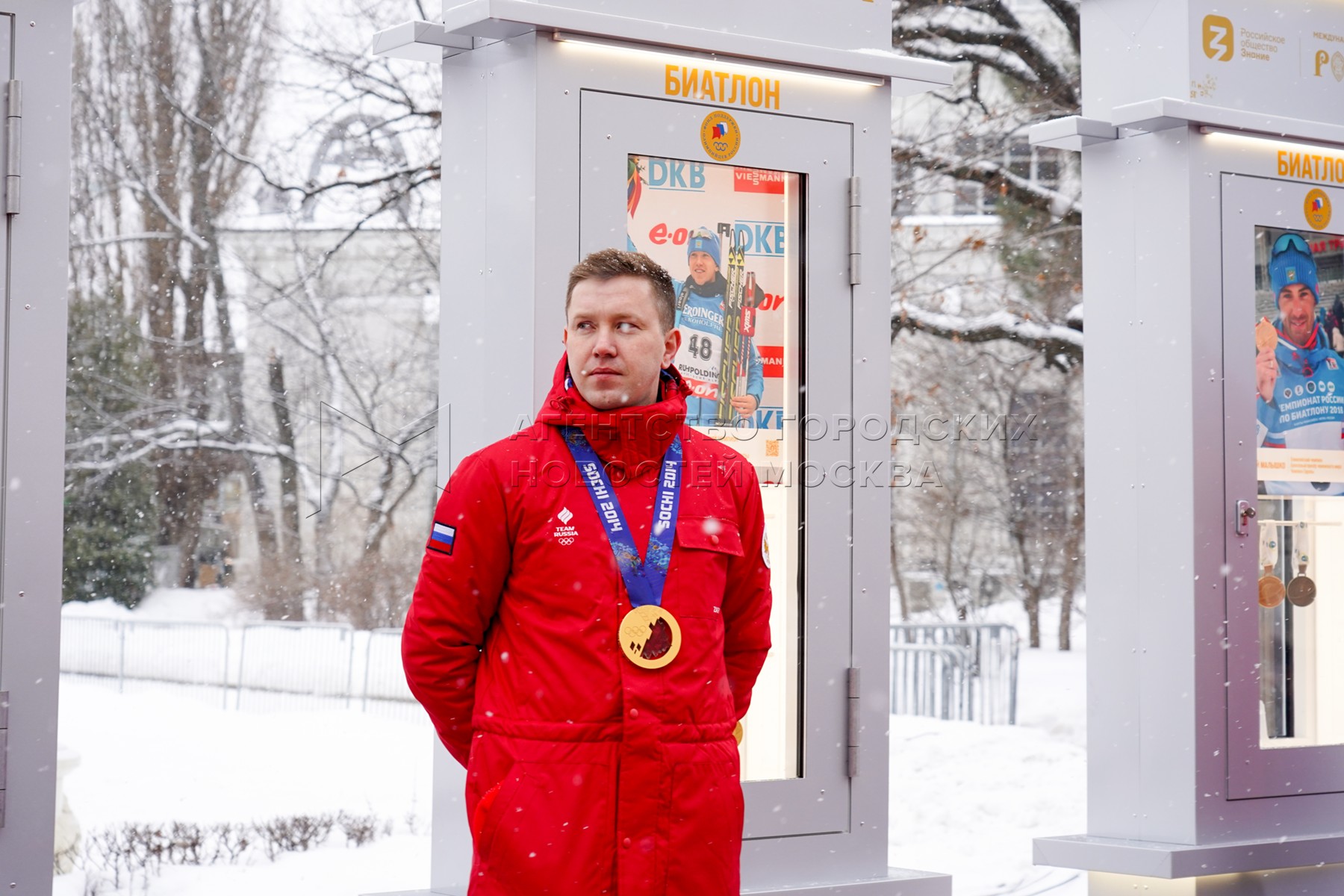 - Описание: Фигуристы Дмитрий Соловьев и Екатерина Боброва, биатлонисты Алексей Волков и Дмитрий Малышко, лыжник Александр Легков (слева направо) на церемонии открытия экспозиции «Аллея славы» Российского общества «Знание», посвященной 10-летнему юбилею зимних Олимпийских игр в Сочи, в рамках международной выставки-форума «Россия» на ВДНХ.