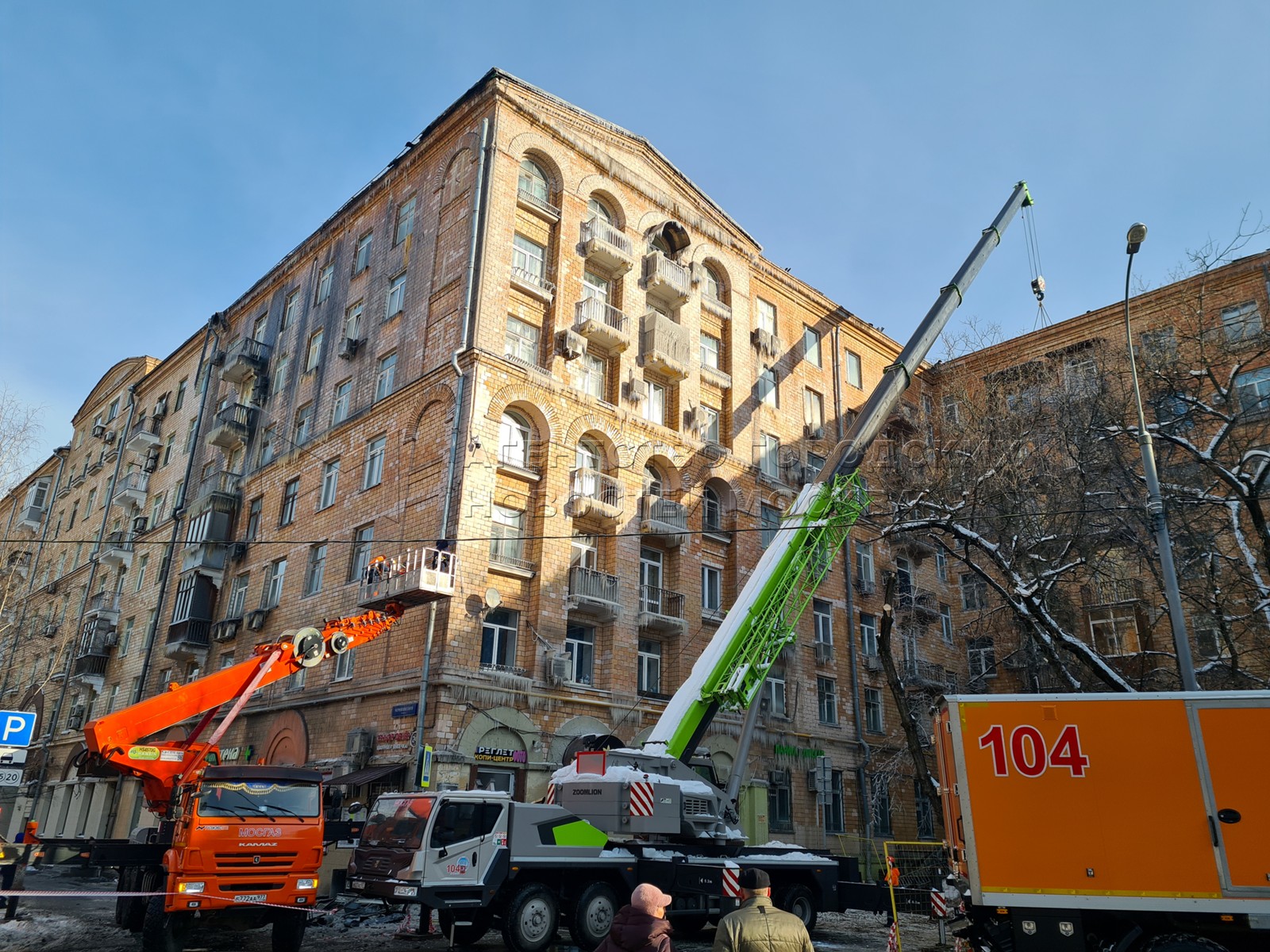 Работа городских служб по разбору сгоревших конструкций кровли жилого дома на ул. Черняховского.