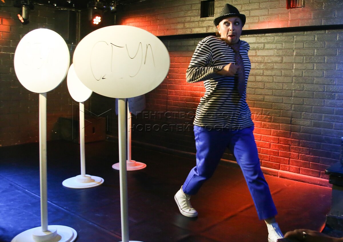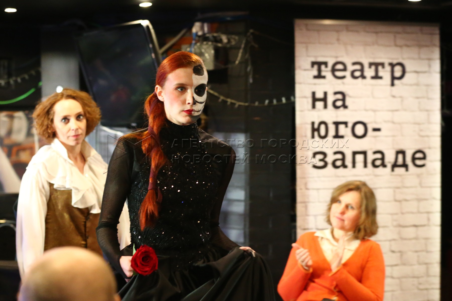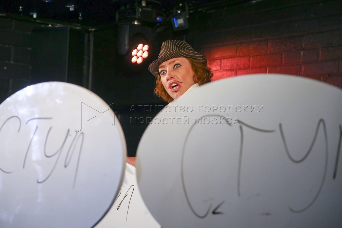 • Описание: Актриса Ольга Авилова (на первом плане) во время показа премьерного спектакля «Дама, чье место по центру» режиссера Максима Метельникова по пьесе Славомира Мрожека «Вдовы» в Театре на Юго-Западе.
