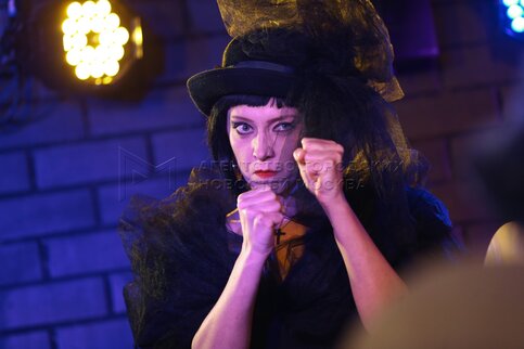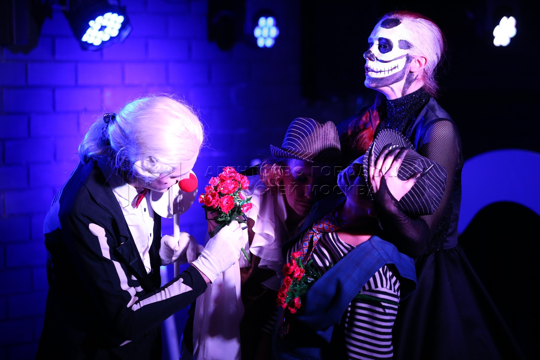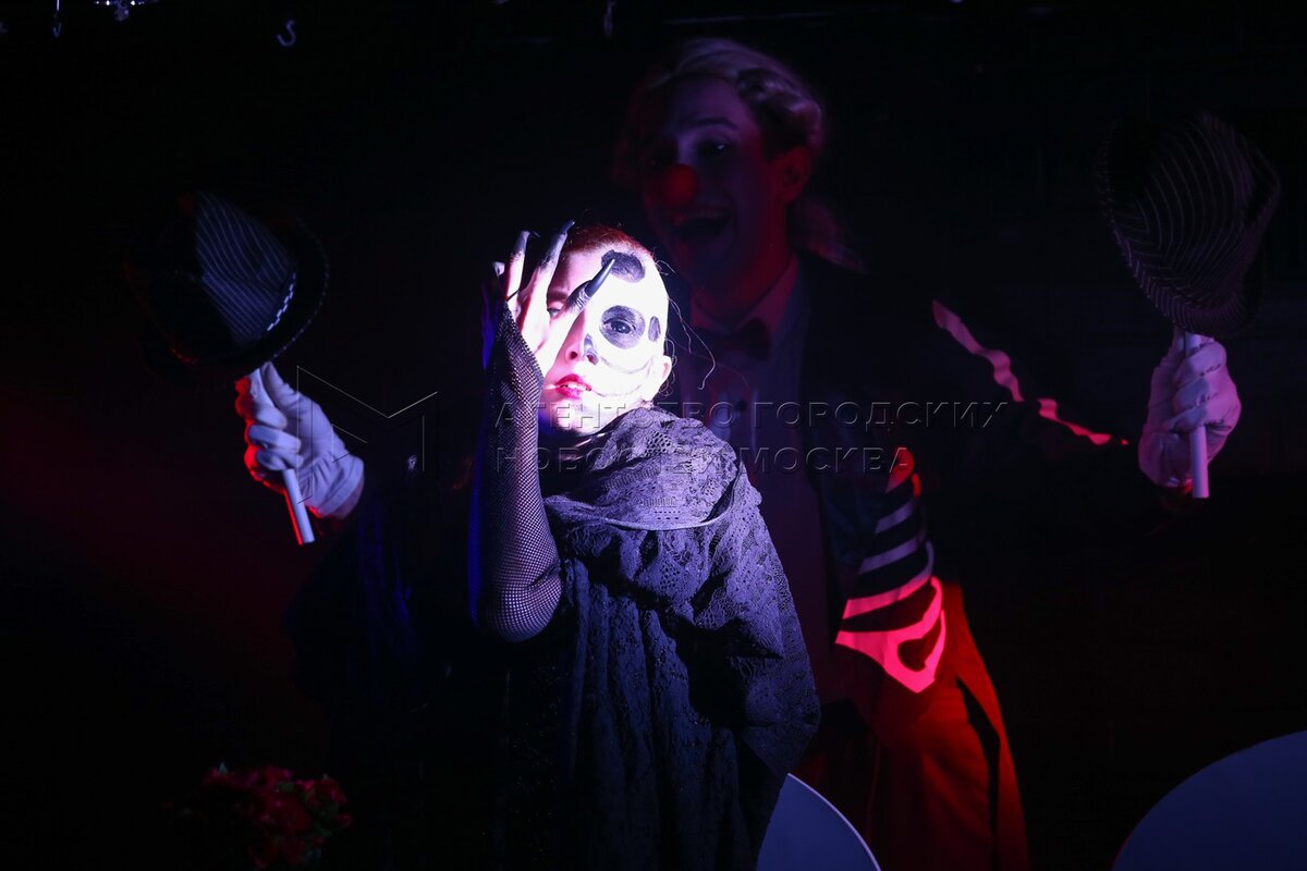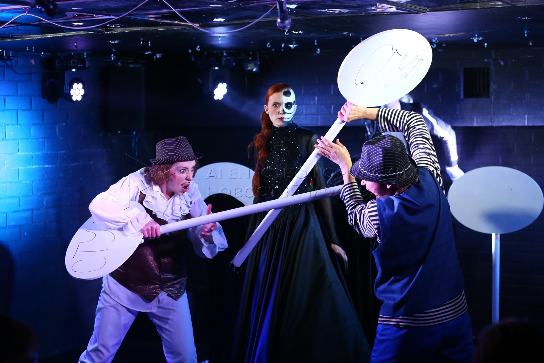 • Описание: Актриса Ольга Авилова (на первом плане) во время показа премьерного спектакля «Дама, чье место по центру» режиссера Максима Метельникова по пьесе Славомира Мрожека «Вдовы» в Театре на Юго-Западе.