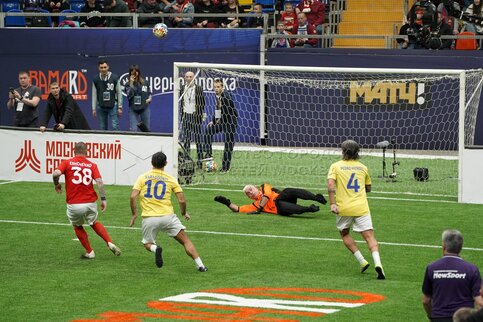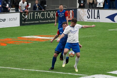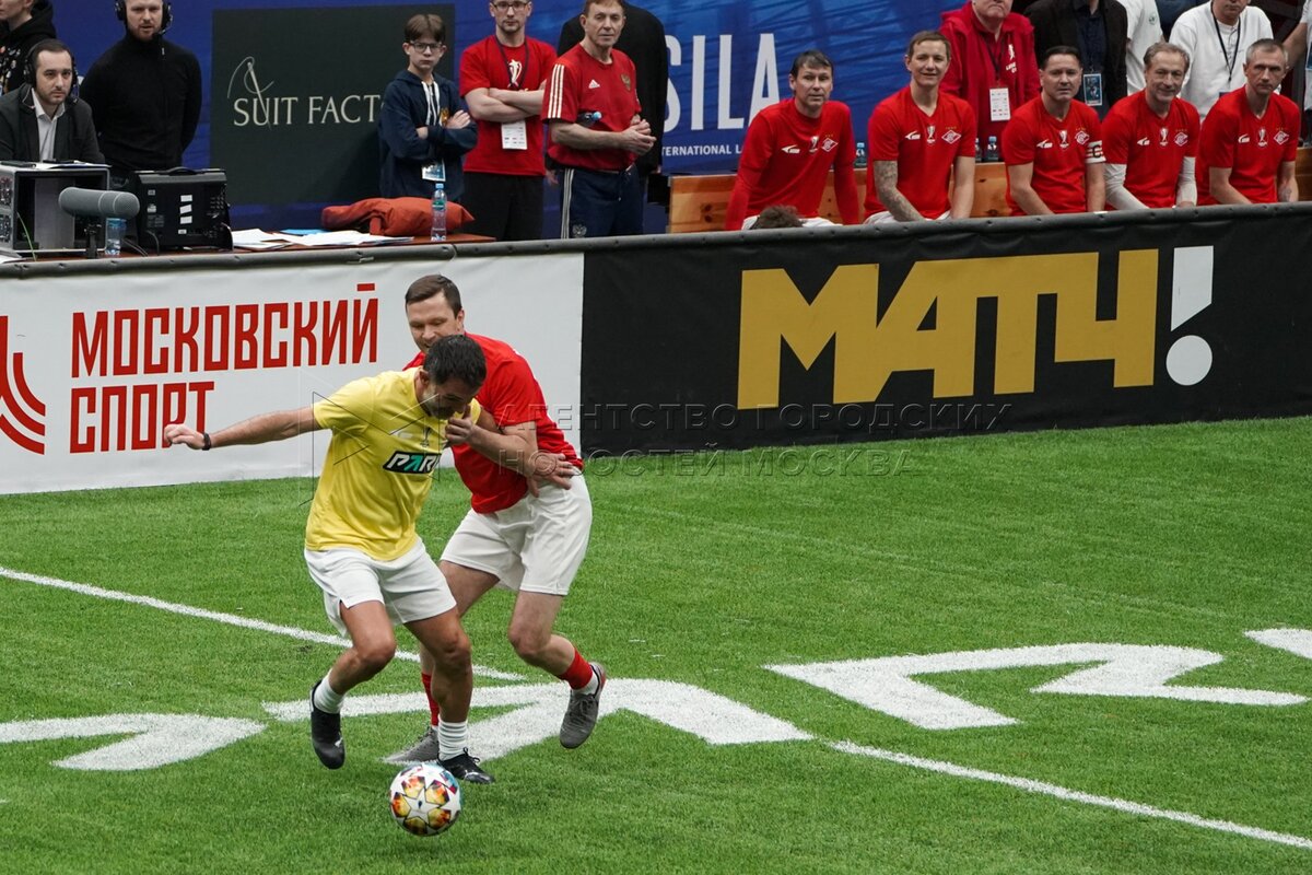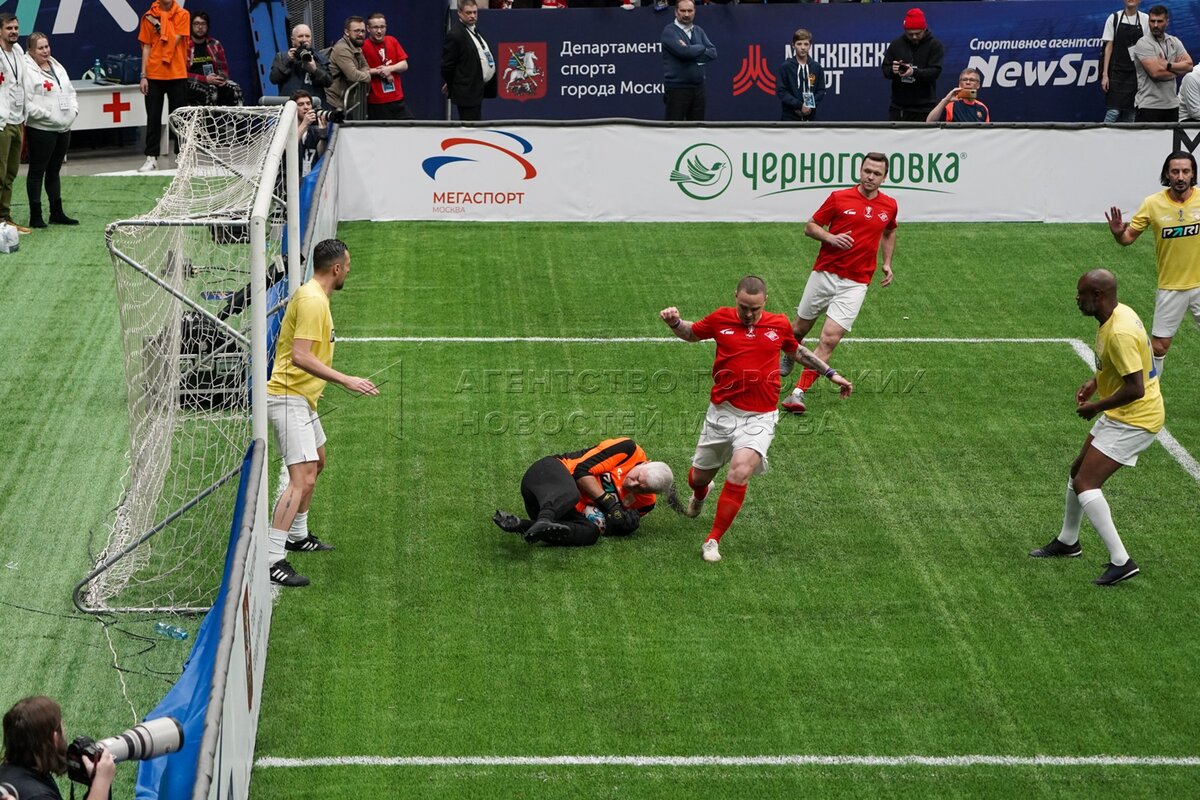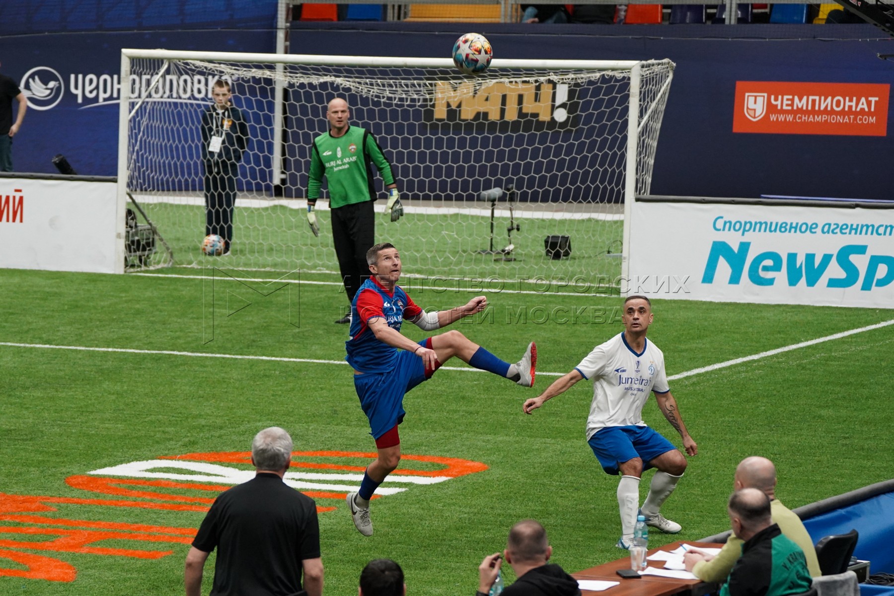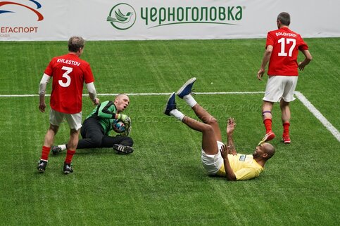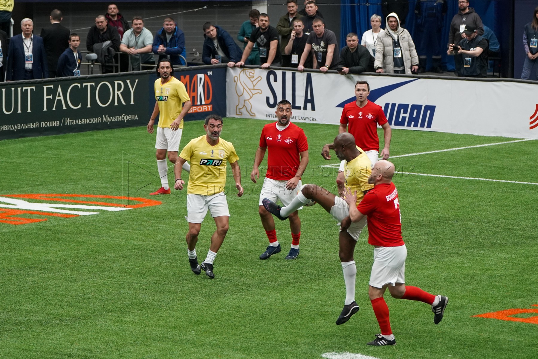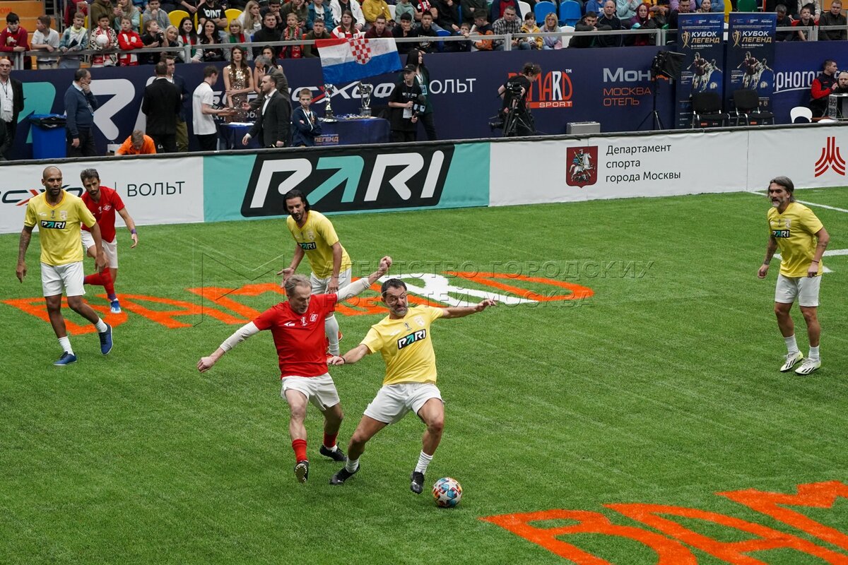 - Описание: Игрок «Легенды Динамо» (слева) и игрок «Легенды ЦСКА» в матче за 3-е место во время 16-го Международного футбольного турнира «Кубок Легенд» имени Константина Еременко во дворце спорта «Мегаспорт».