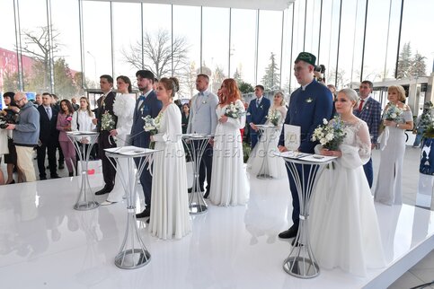 • Описание: Церемония бракосочетания молодоженов – работников атомной отрасли из разных городов России в павильоне «Атом» в рамках выставки-форума «Россия» на ВДНХ.