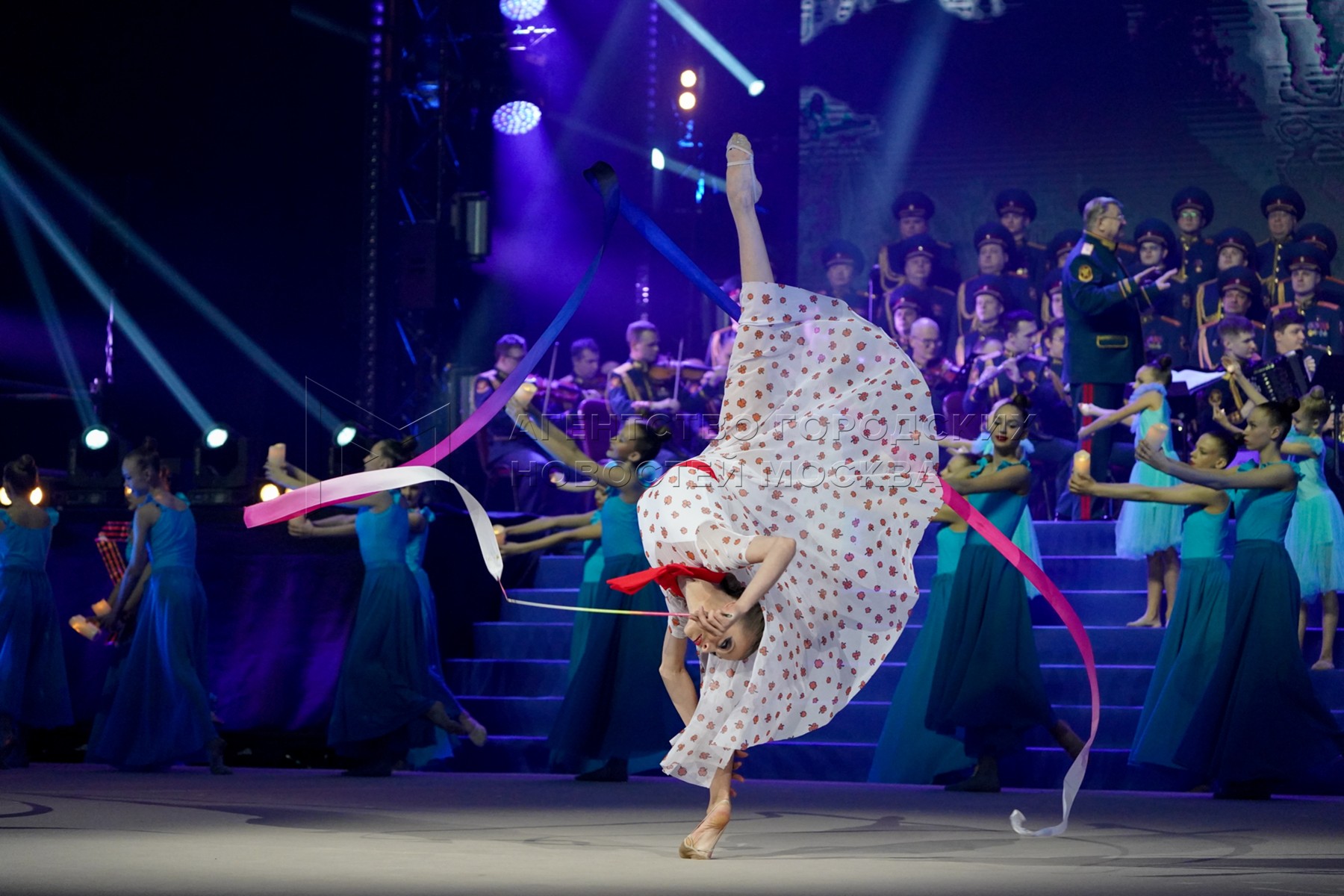Выступление гимнасток с лентами. Концерт ко Дню защитника Отечества во Дворце гим...