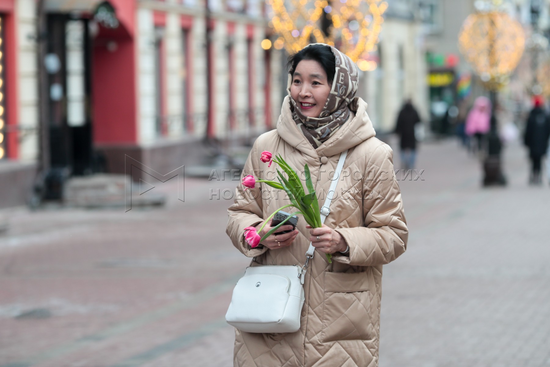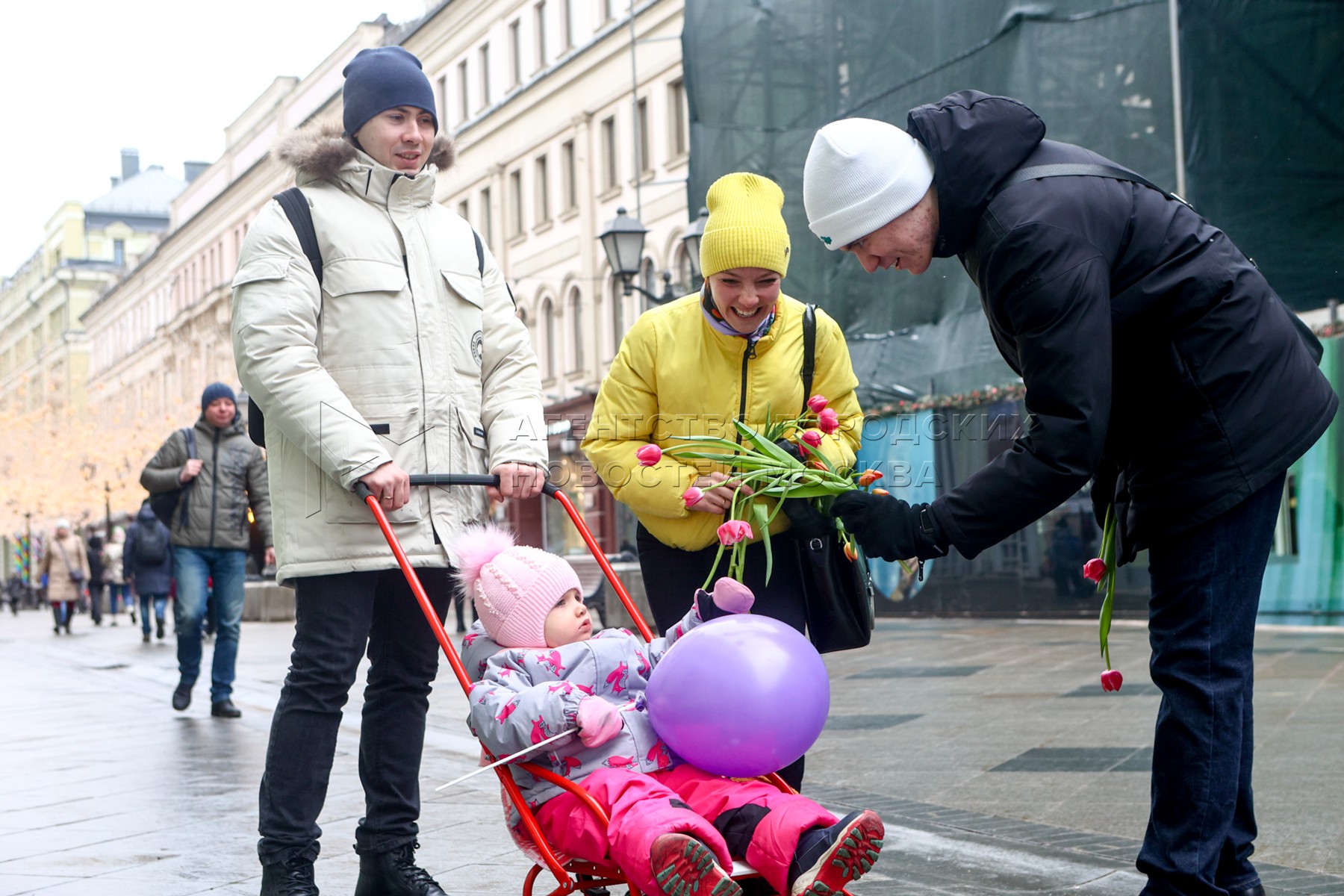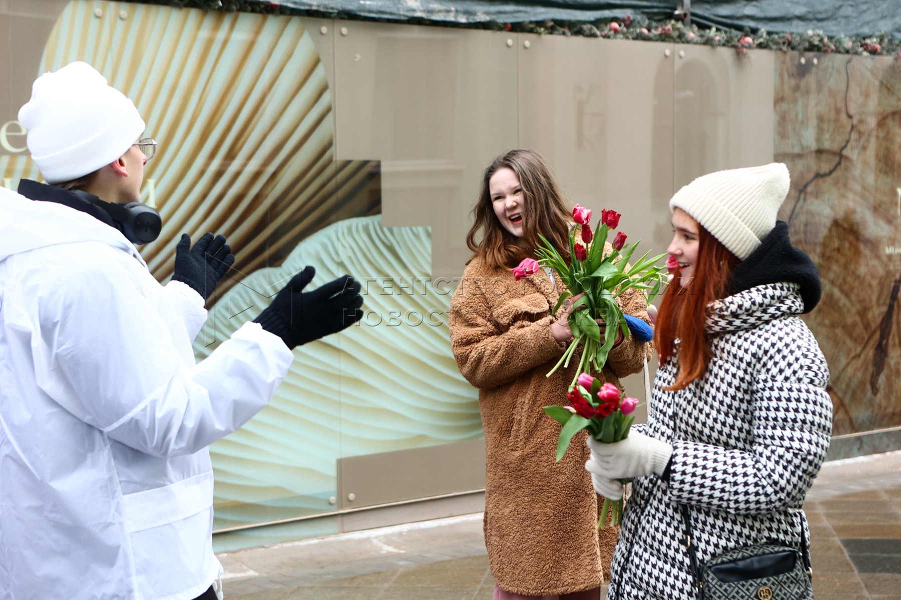 Поздравление с 8 марта на ул. Старый Арбат в центре Москвы.