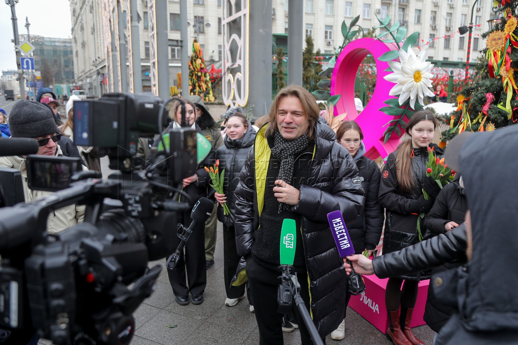 Певец Дмитрий Маликов на Тверской площади поздравляет с международным женским дне...