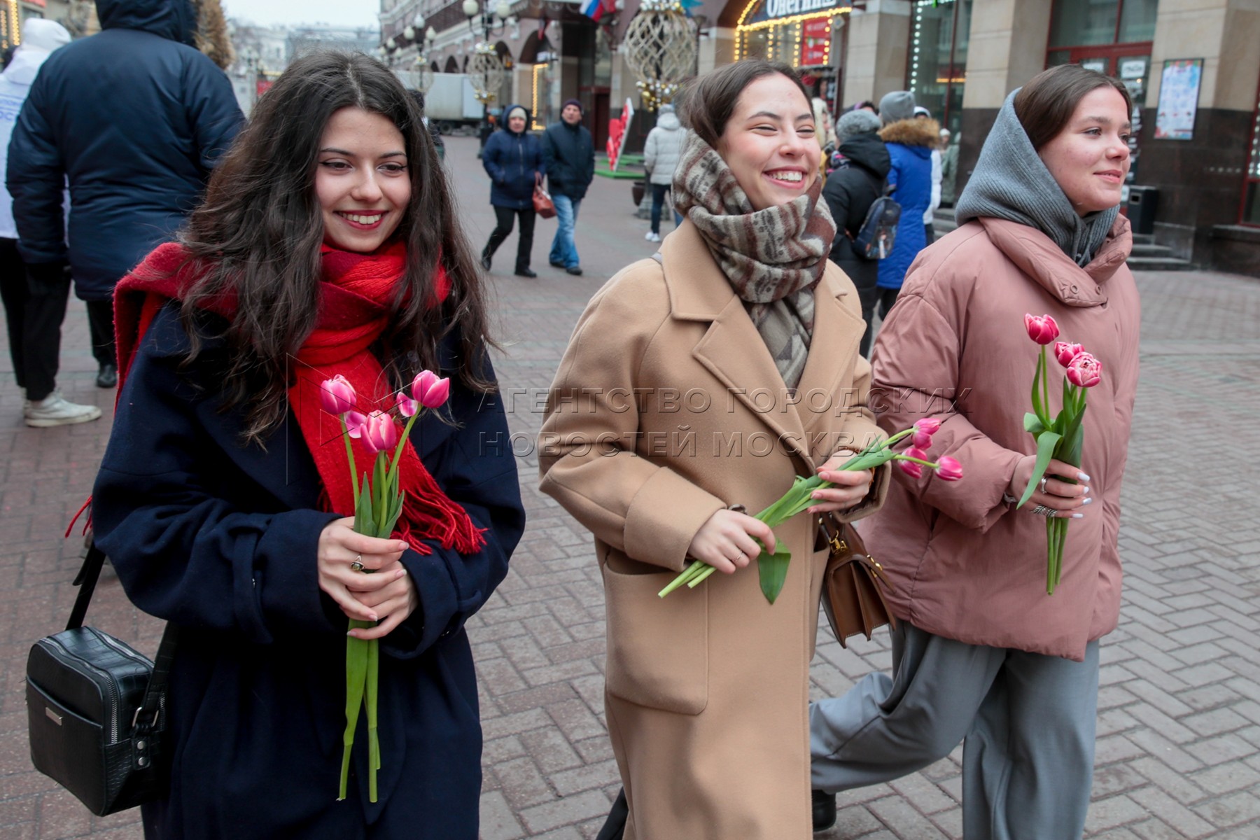 Поздравление с 8 марта на ул. Старый Арбат в центре Москвы.