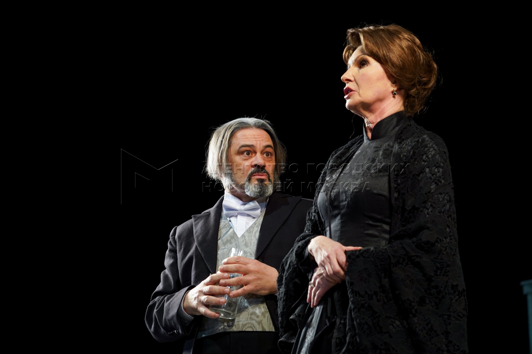 Актеры Олег Чудницов в роли Павлина Савельича и Людмила Светлова в роли Меропии Давыдовны Мурзавецкой во время показа премьерного спектакля «Волки и овцы» в театре на Малой Ордынке.