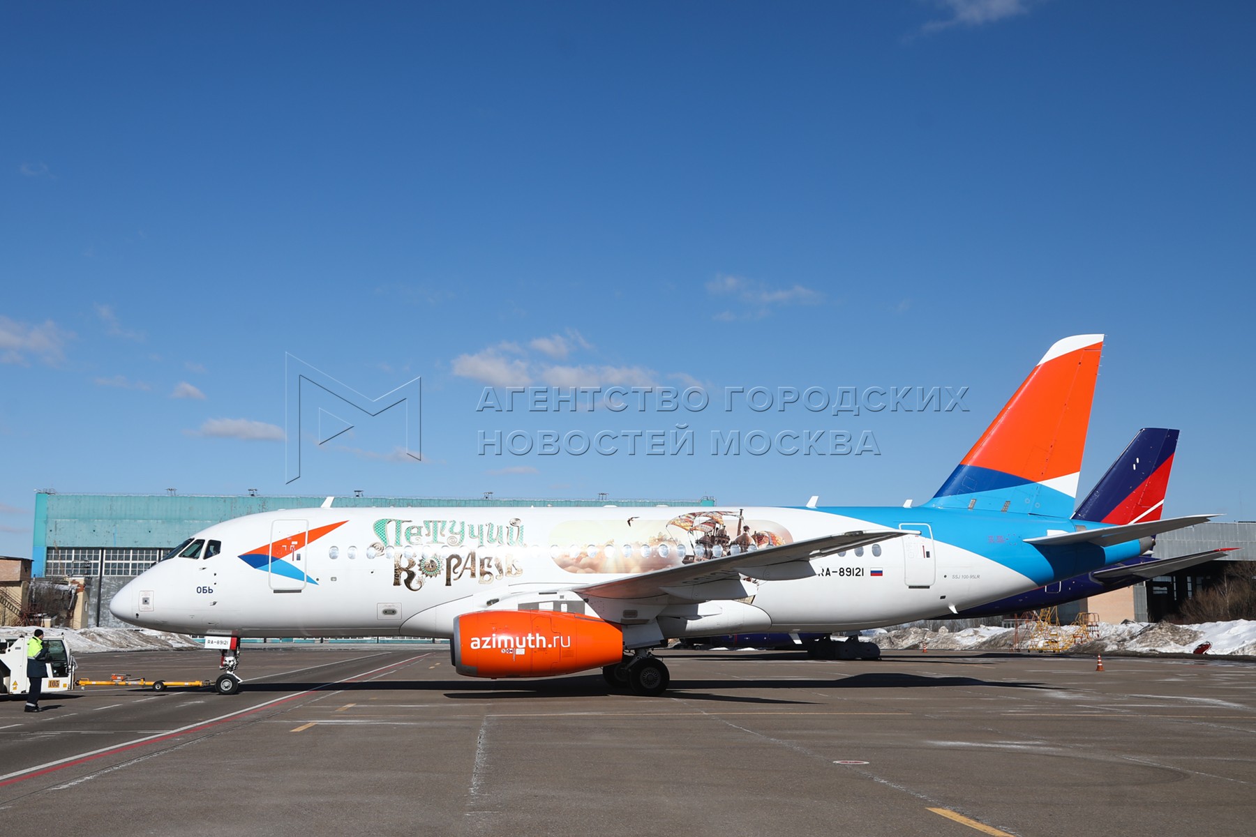 Презентация в международном аэропорту Внуково новой ливреи самолета авиакомпании «Азимут», созданной по мотивам кинофильма «Летучий корабль».
