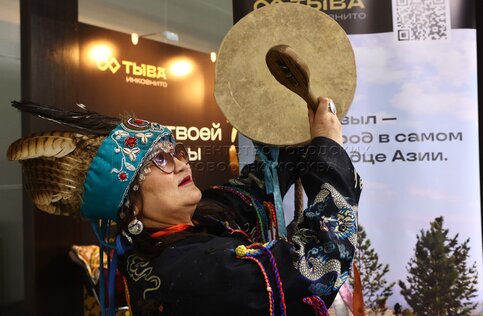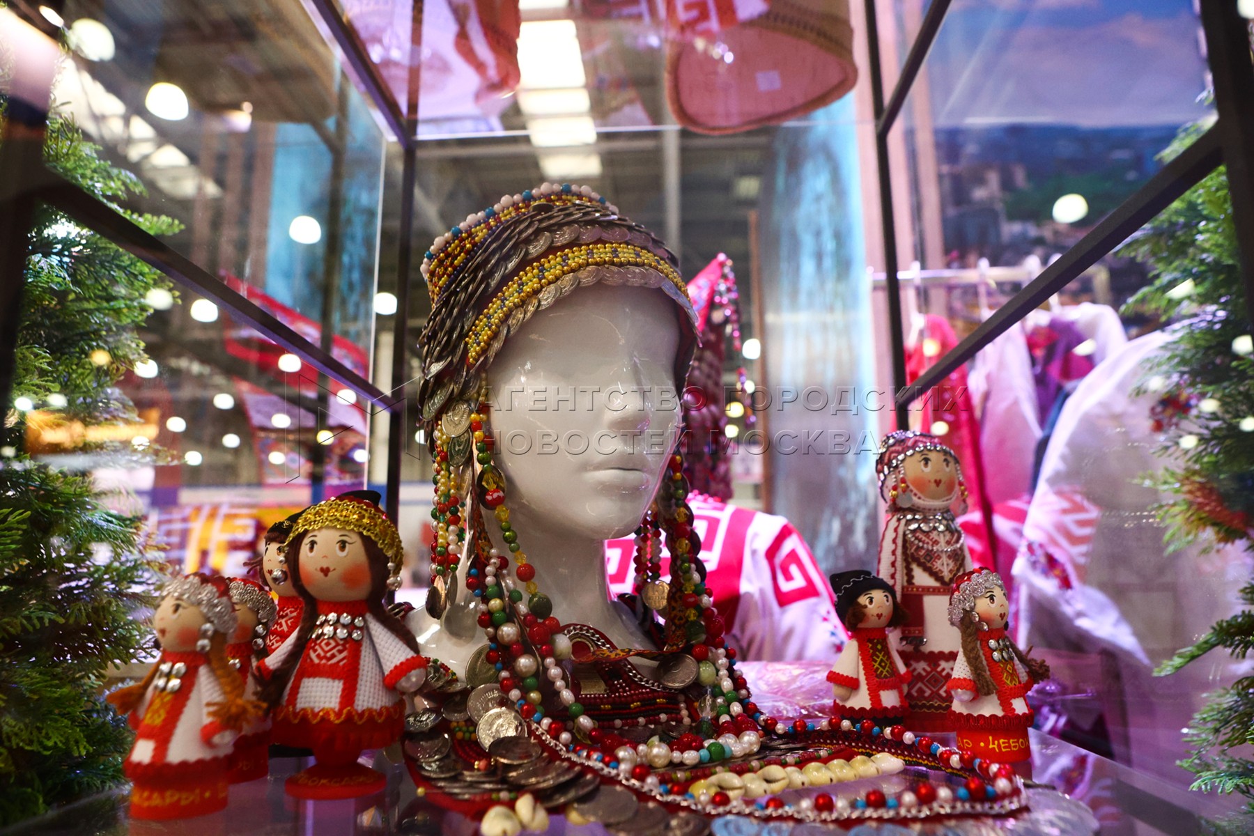 Участник выставки в национальной одежде. Международная выставка туризма и индустр...