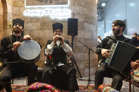 Участники выставки, музыканты в национальной одежде. Международная выставка туриз...
