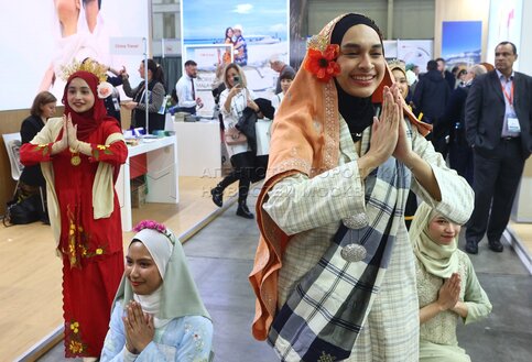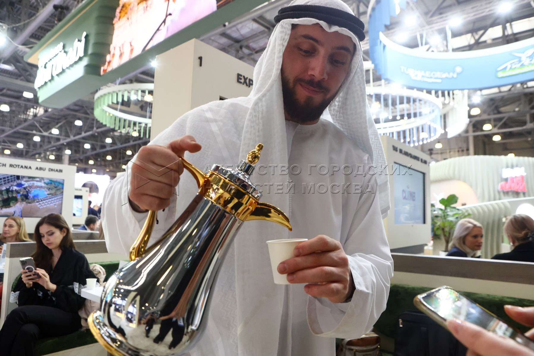 Участник выставки в национальной арабской одежде. Международная выставка туризма ...
