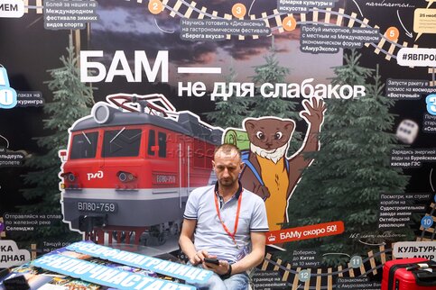 Посетитель в 3D-очках, (виртуальная реальность). Международная выставка туризма и...