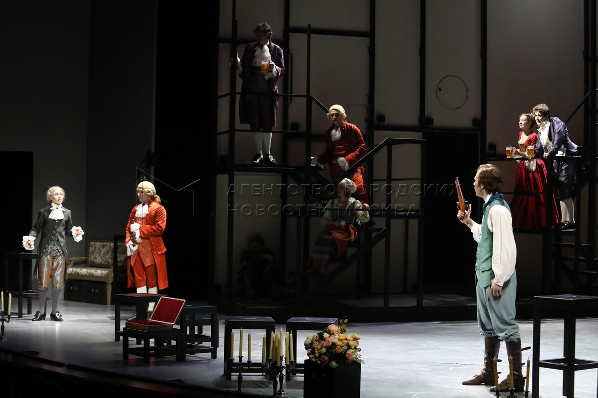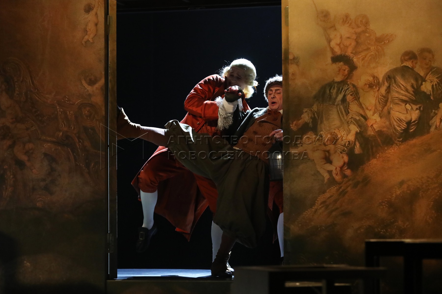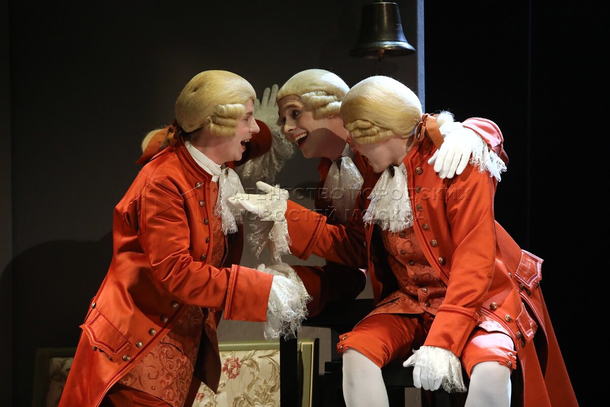 Актер Андрей Кондаков в роли Маскариля, слуги Валеры (в центре) во время премьерн...