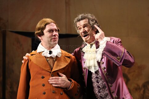 Актеры Андрей Кондаков в роли Маскариля, слуги Валера (слева) и Павел Суханов в р...