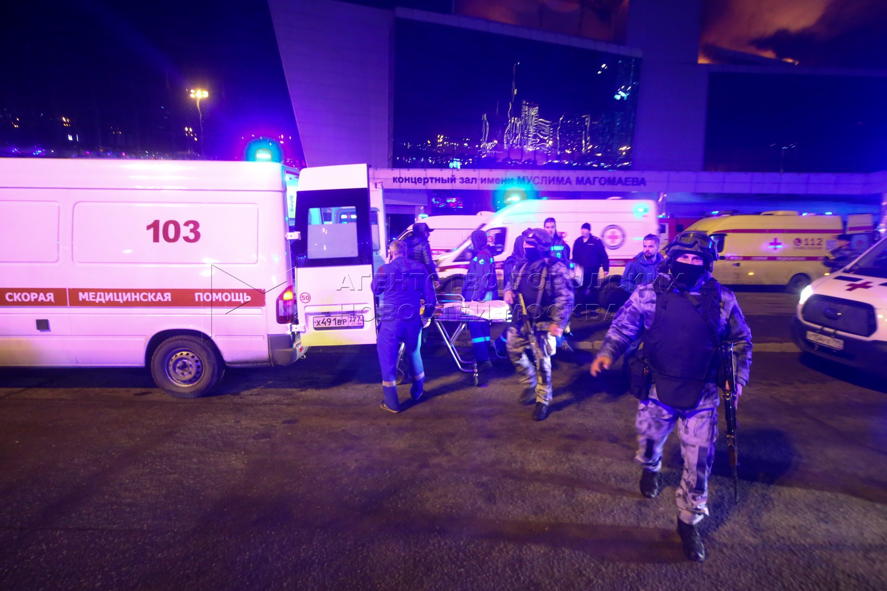 • Описание: Оперативные службы около горящего здания Crocus City Hall в подмосковном Красногорске.