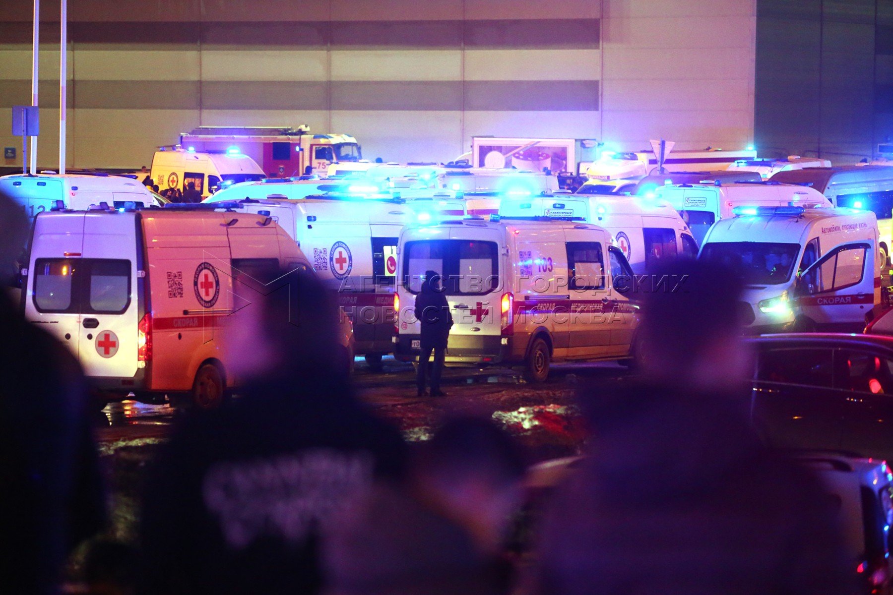 • Заголовок: Оперативные службы около горящего здания Crocus City Hall в подмосковном Красногорске