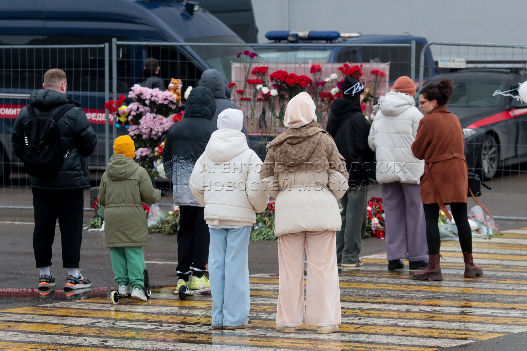 - Описание: Люди несут цветы, свечи и мягкие игрушки в память о жертвах теракта в подмосковном Crocus City Hall.