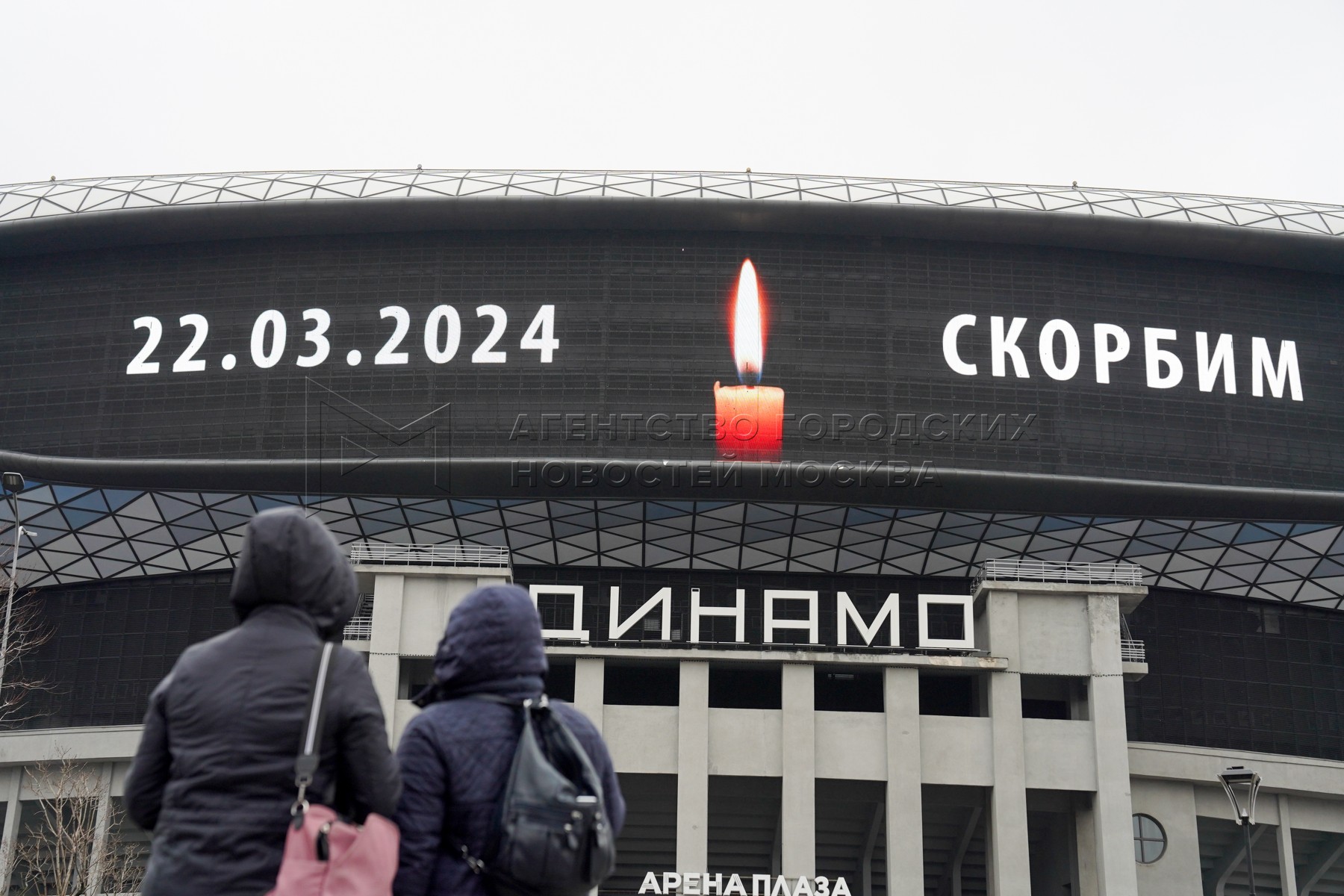 Надпись «Скорбим» на медиаэкране «ВТБ Арены» – центрального стадиона «Динамо» име...