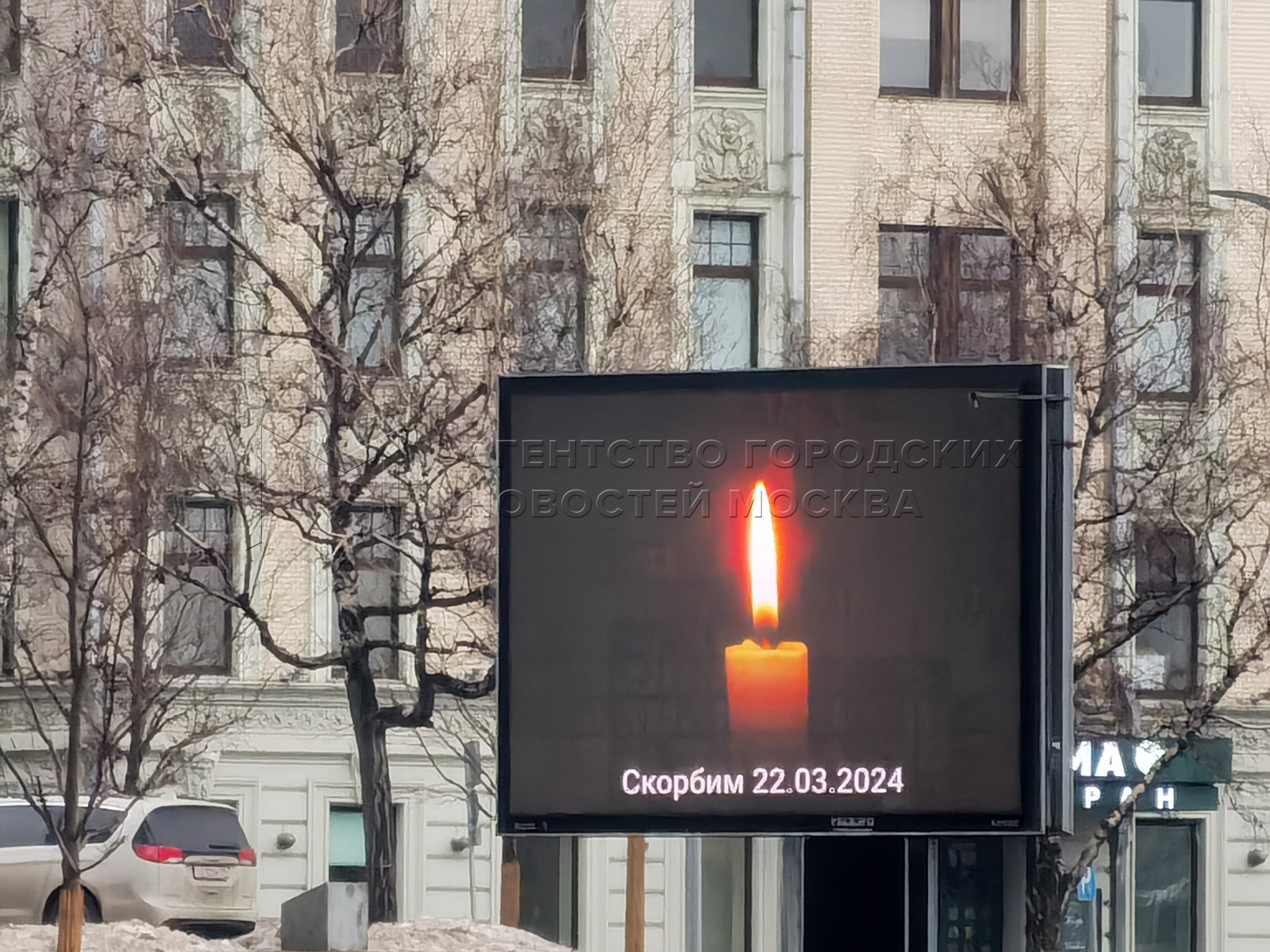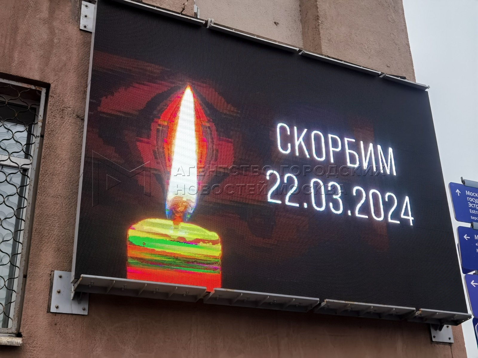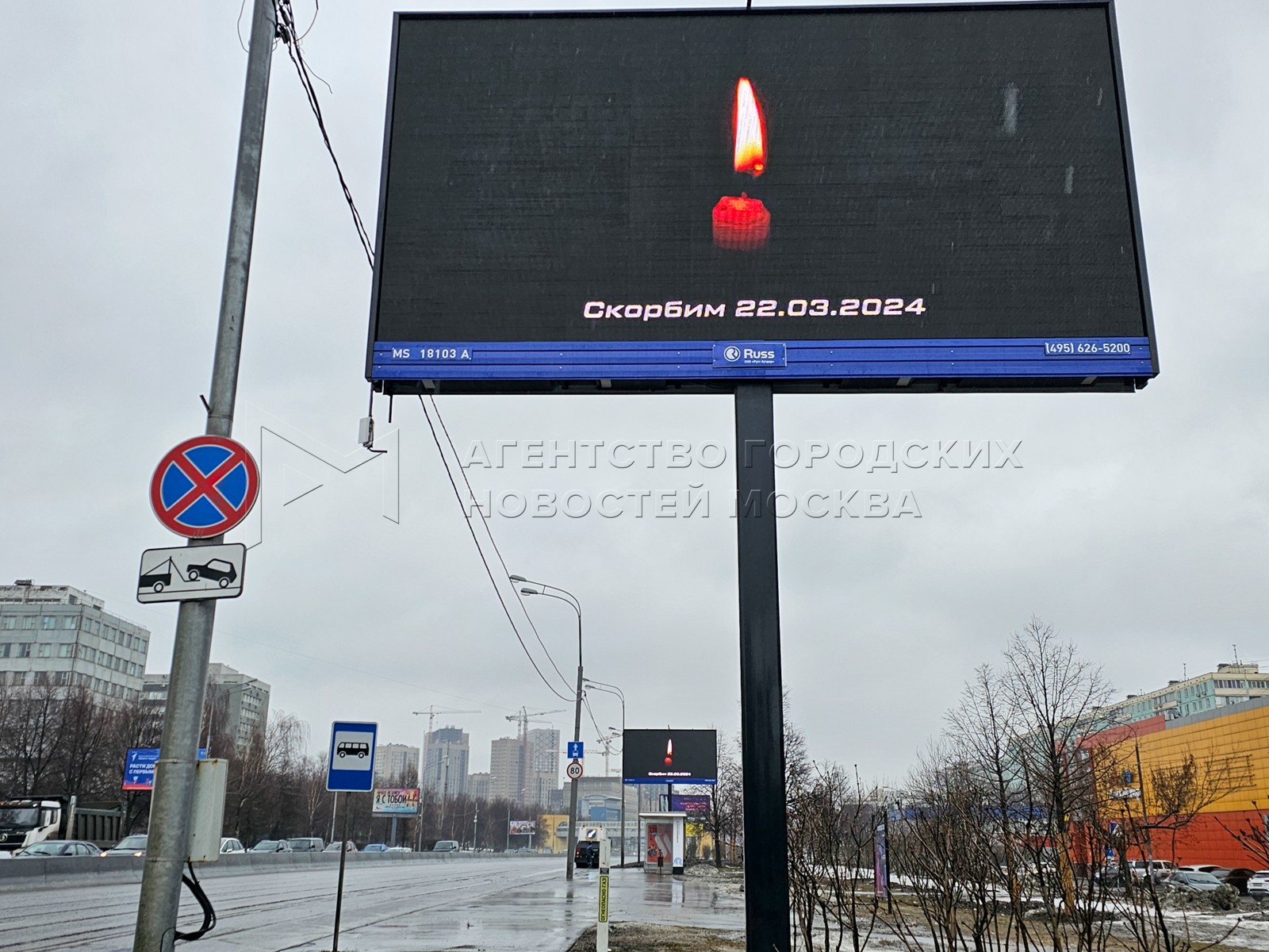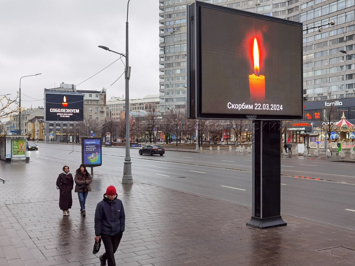 - Описание: Уличные медиаэкраны в столице с изображением свечи и траурной надписью в память о жертвах теракта в подмосковном Crocus City Hall.
