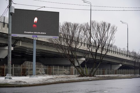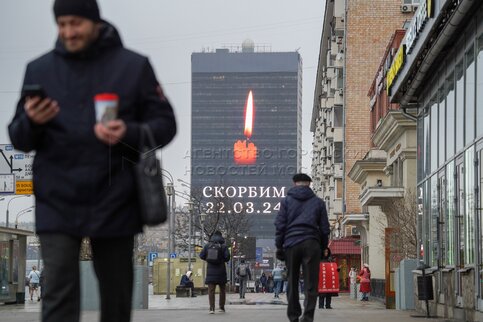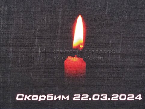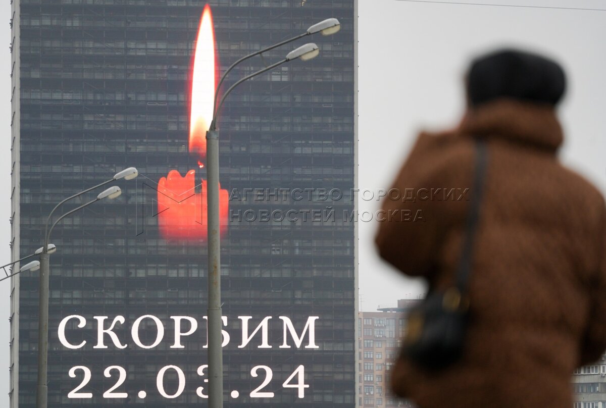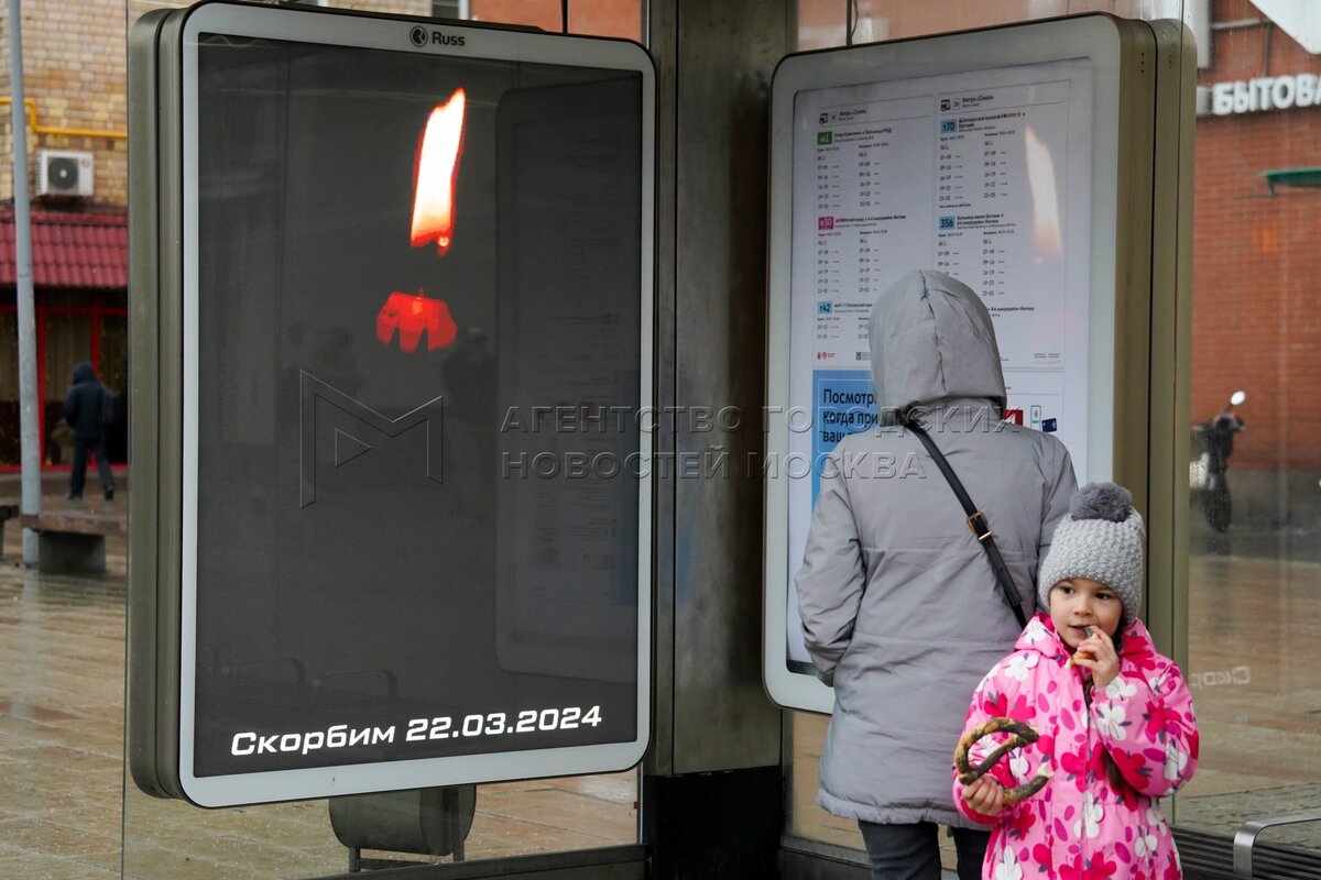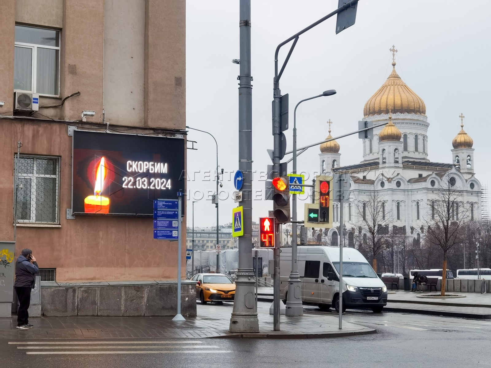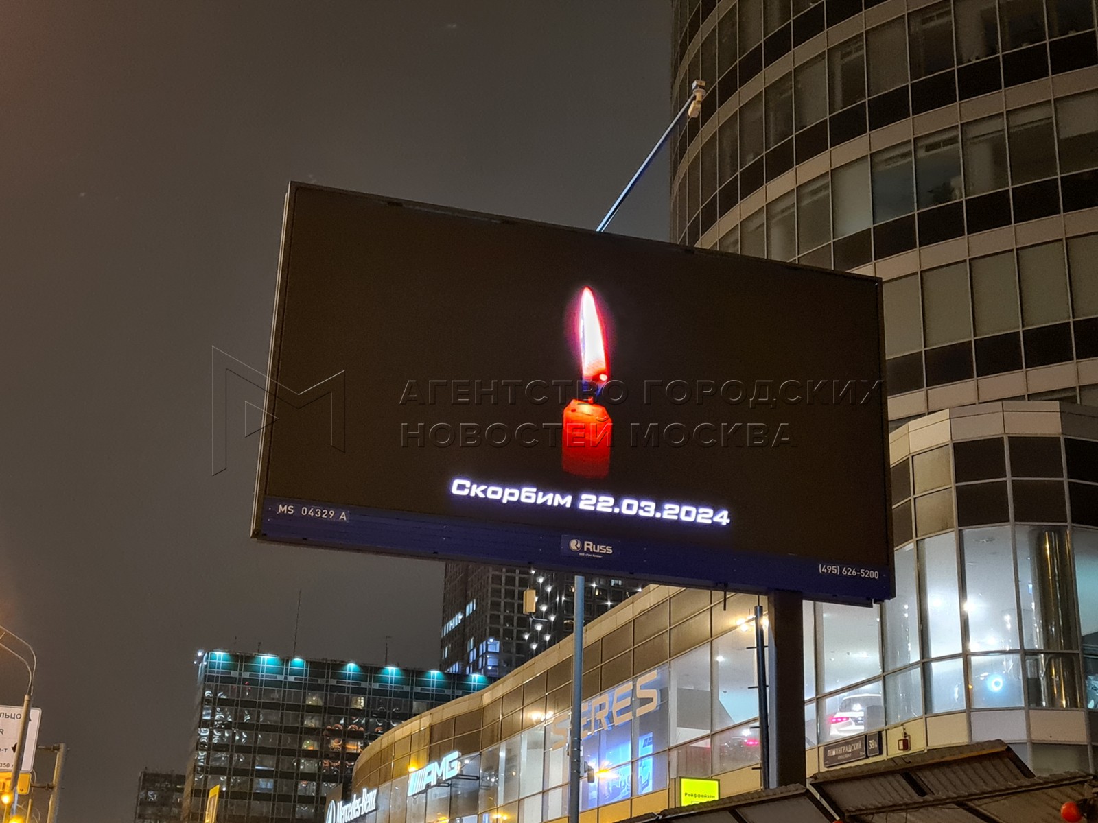 - Описание: Уличные медиаэкраны в столице с изображением свечи и траурной надписью в память о жертвах теракта в подмосковном Crocus City Hall.