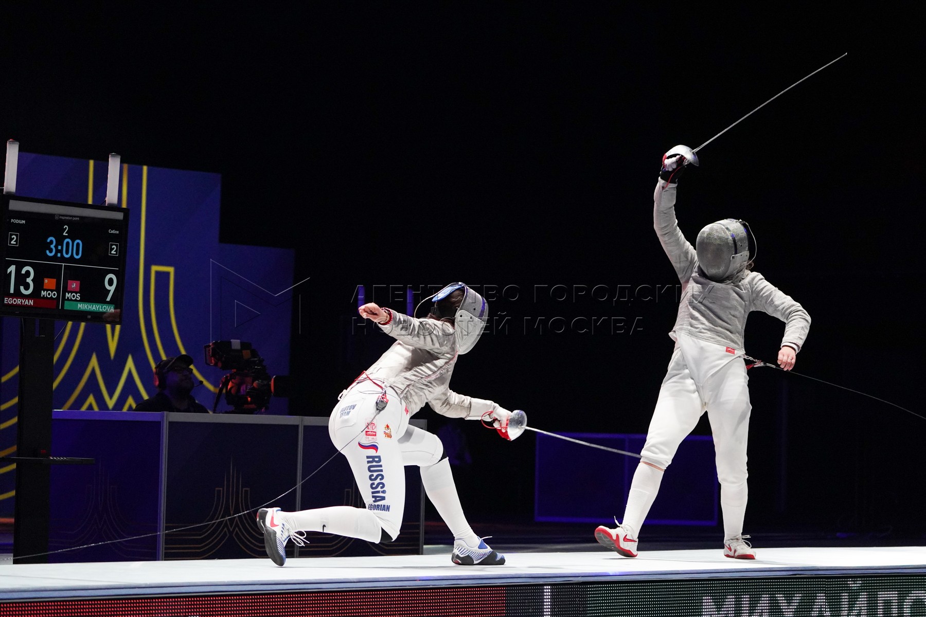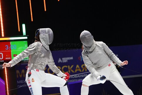 Саблистки Яна Егорян (слева) и Александра Михайлова в четвертьфинальном поединке ...