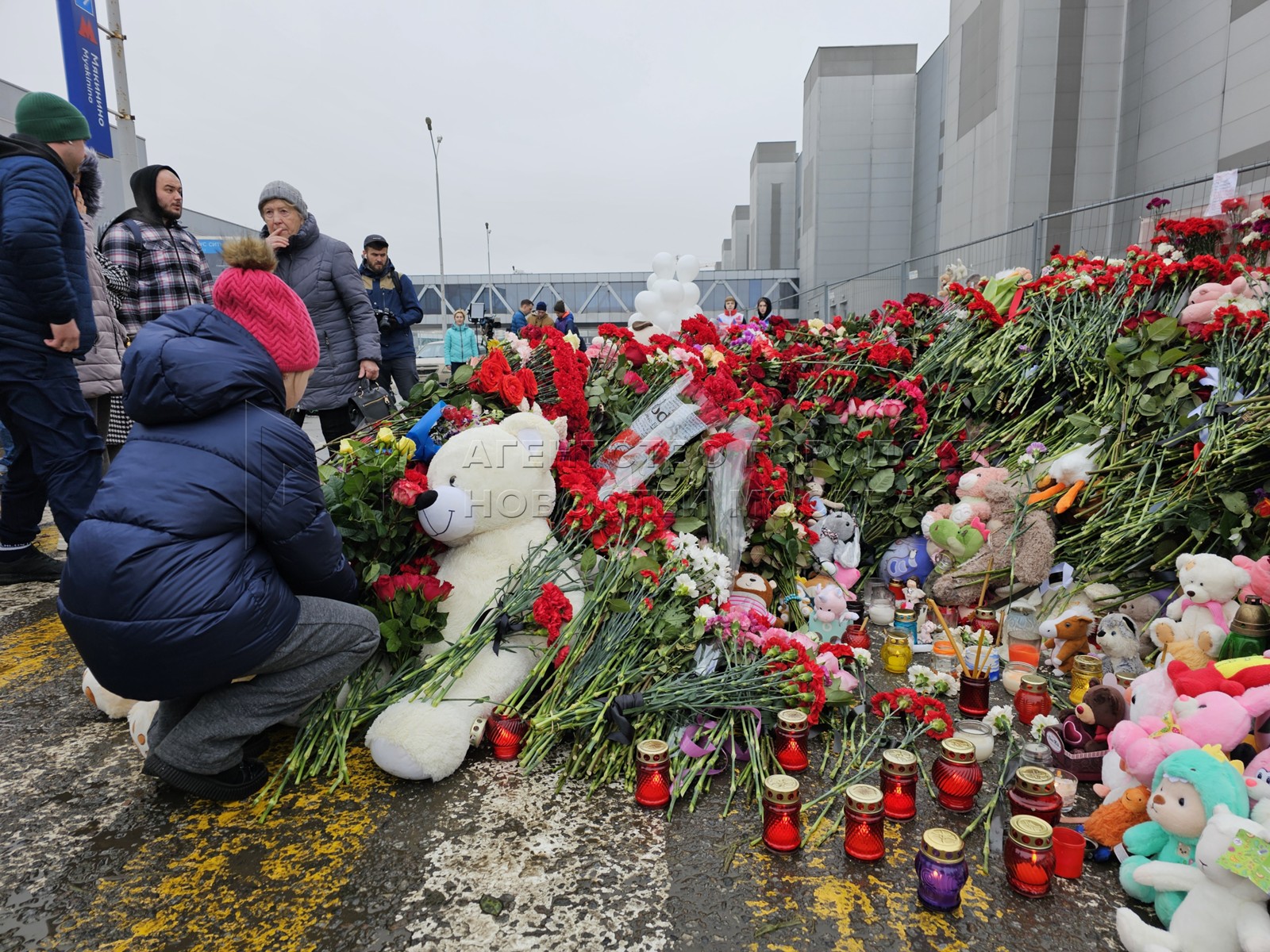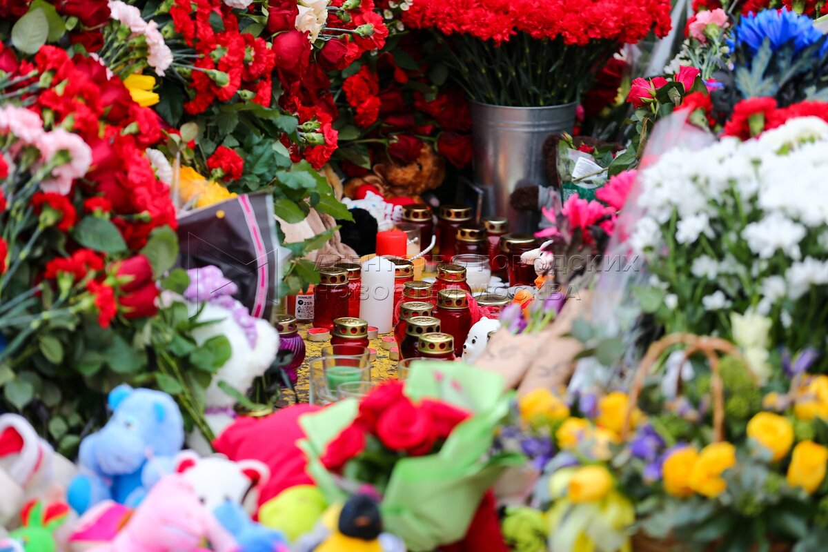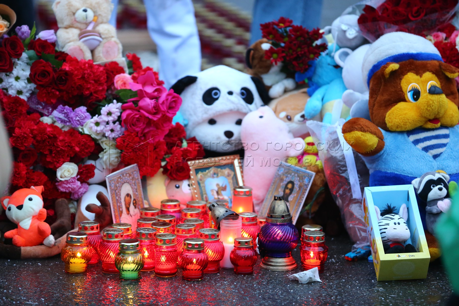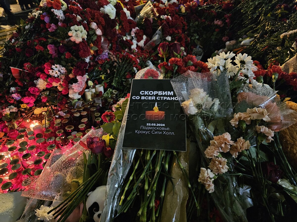 • Описание: Цветы, свечи и мягкие игрушки в память о жертвах теракта в подмосковном Crocus City Hall.