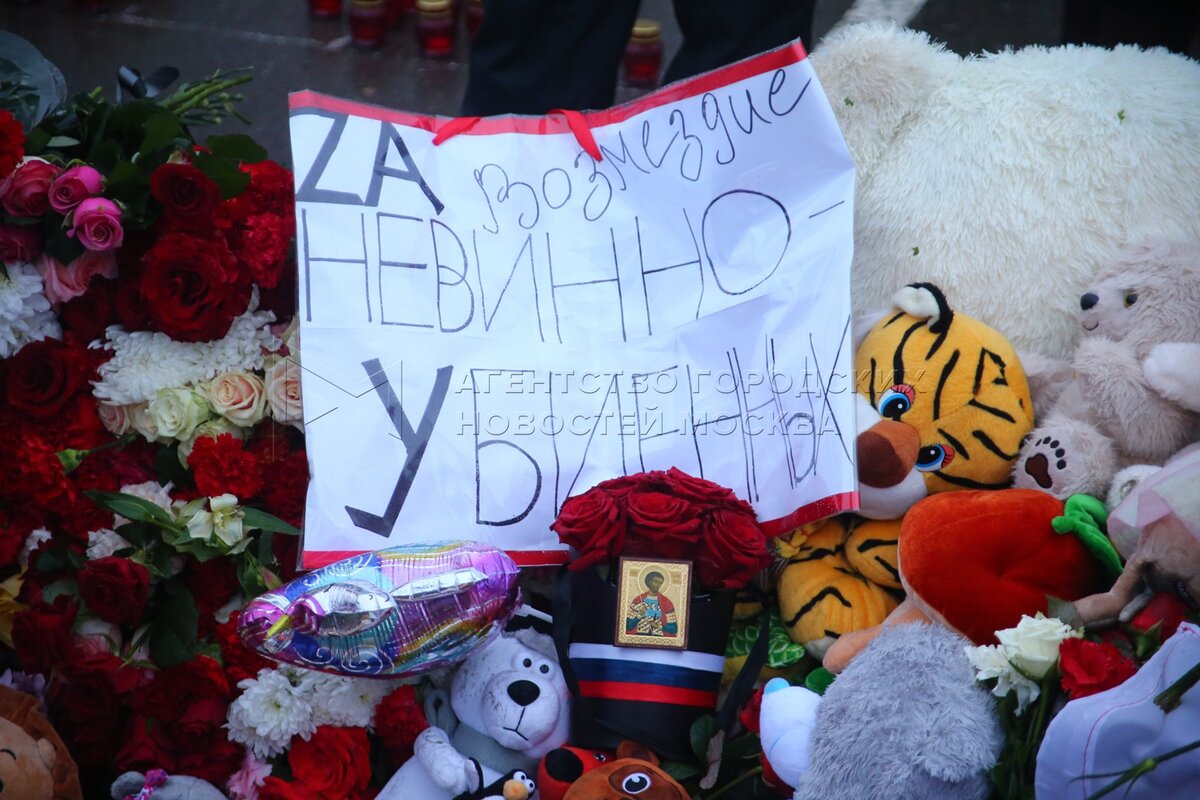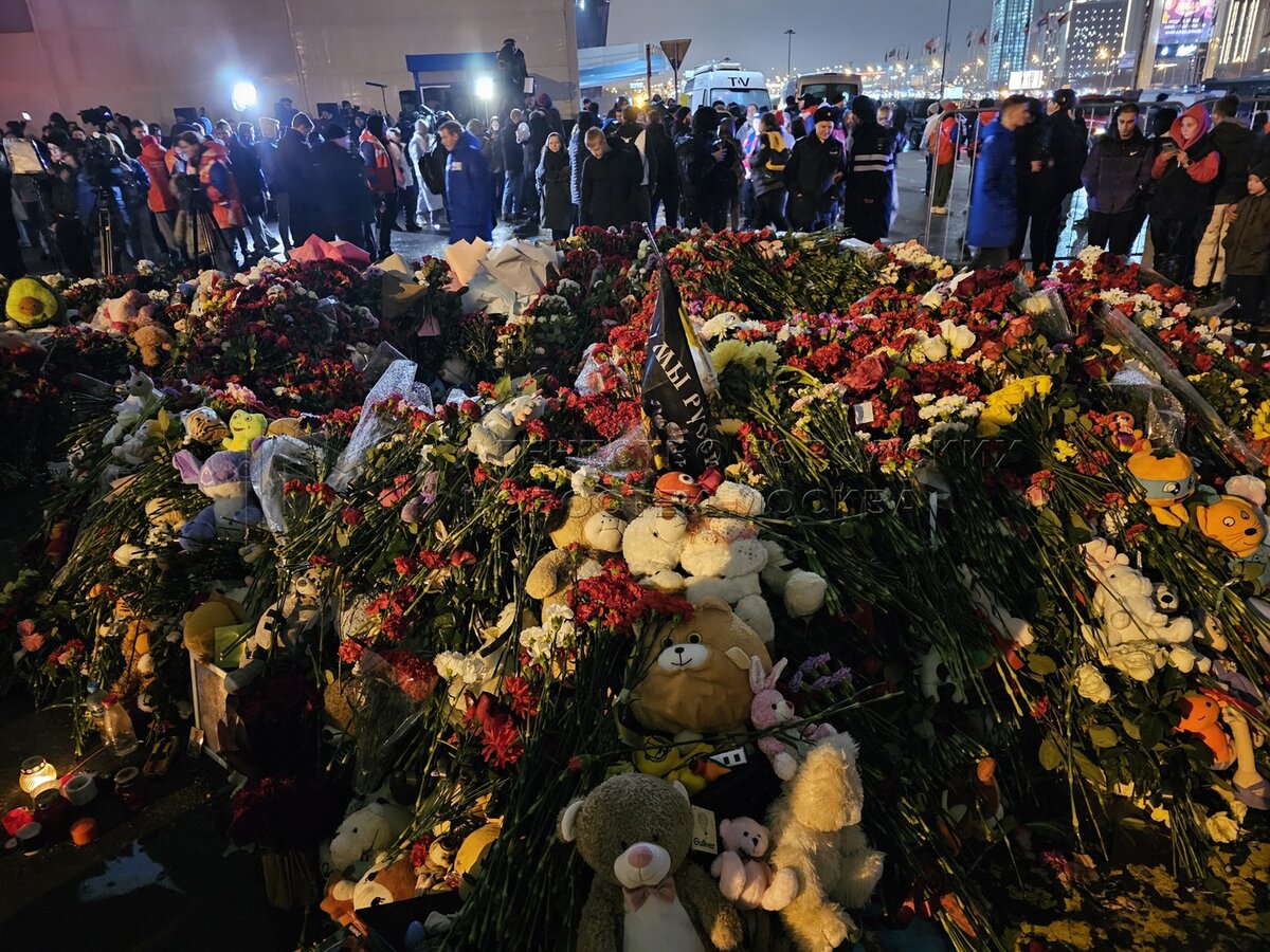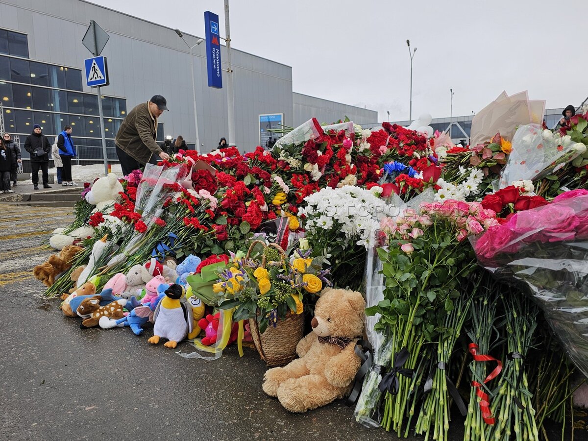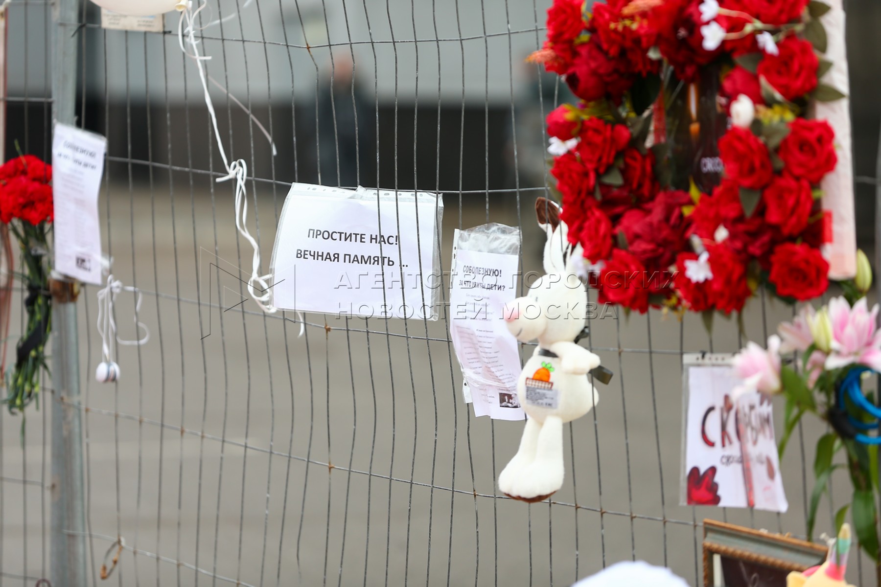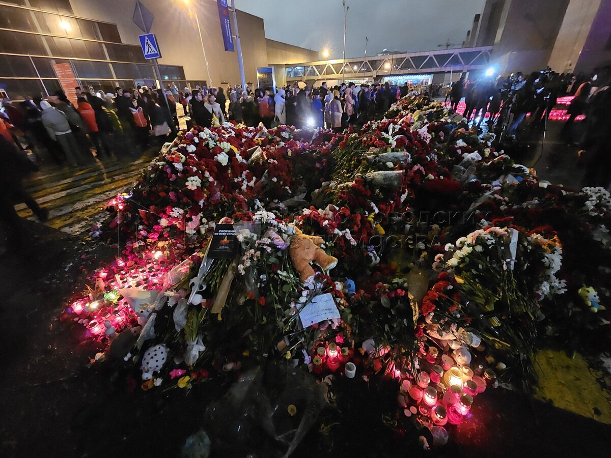 • Описание: Цветы, свечи и мягкие игрушки в память о жертвах теракта в подмосковном Crocus City Hall.
