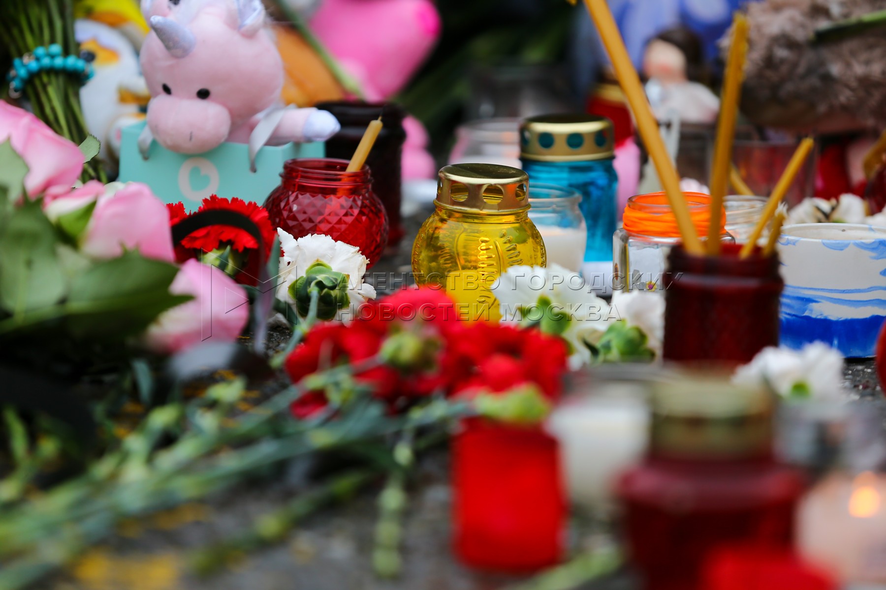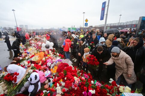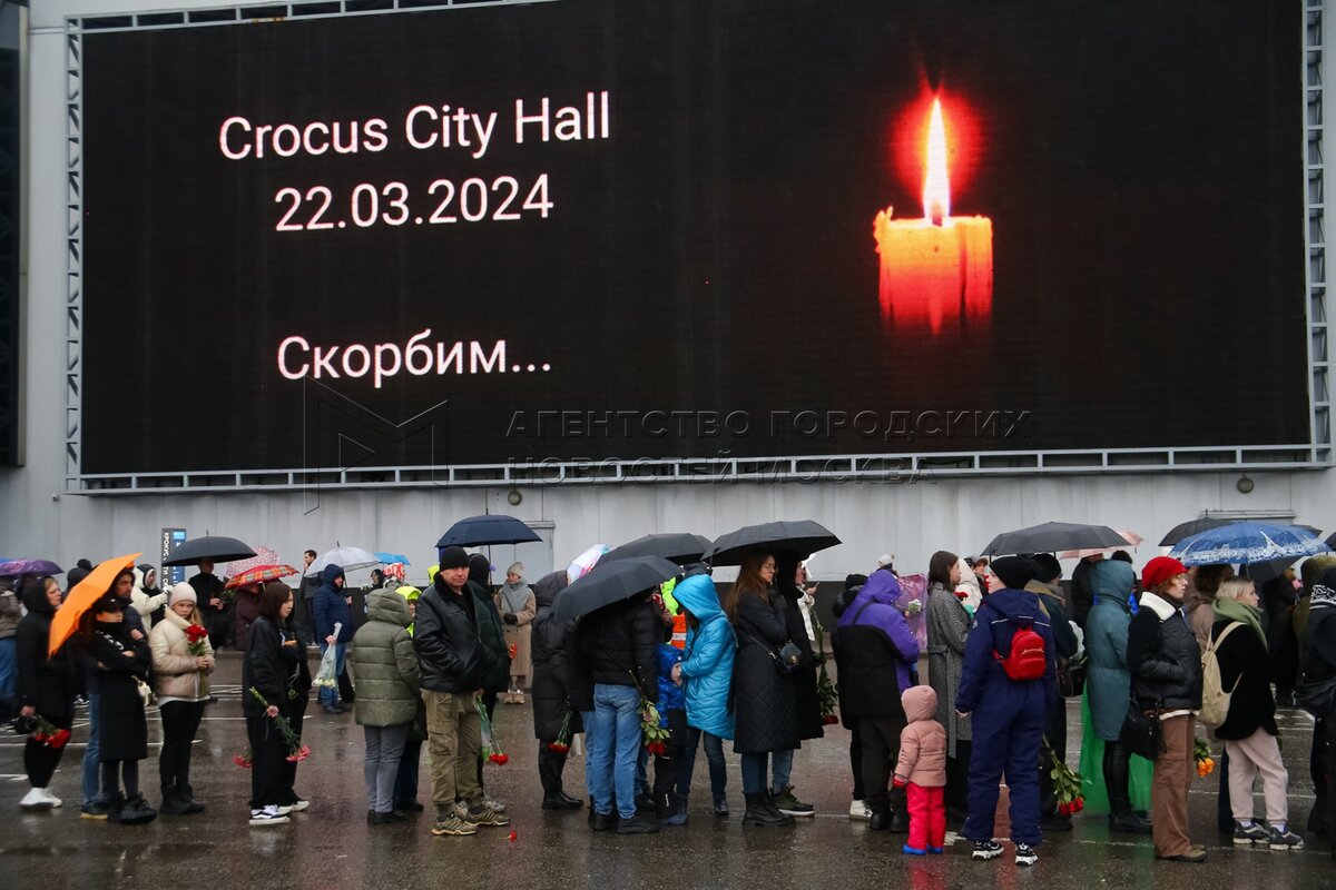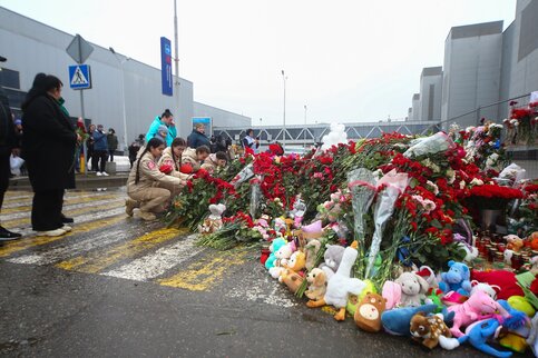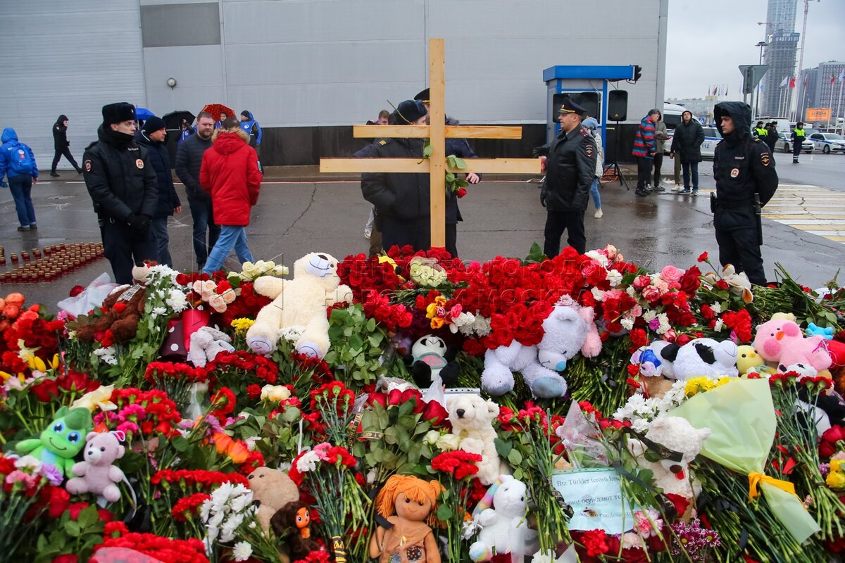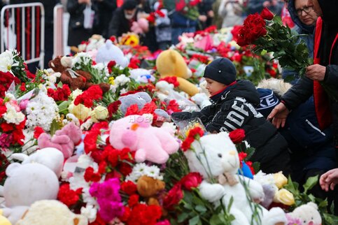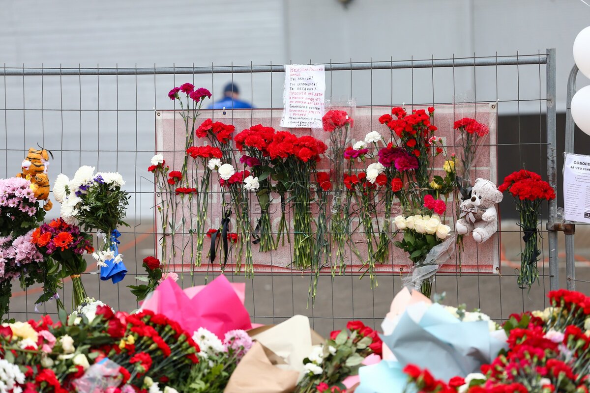 • Описание: Цветы, свечи и мягкие игрушки в память о жертвах теракта в подмосковном Crocus City Hall.