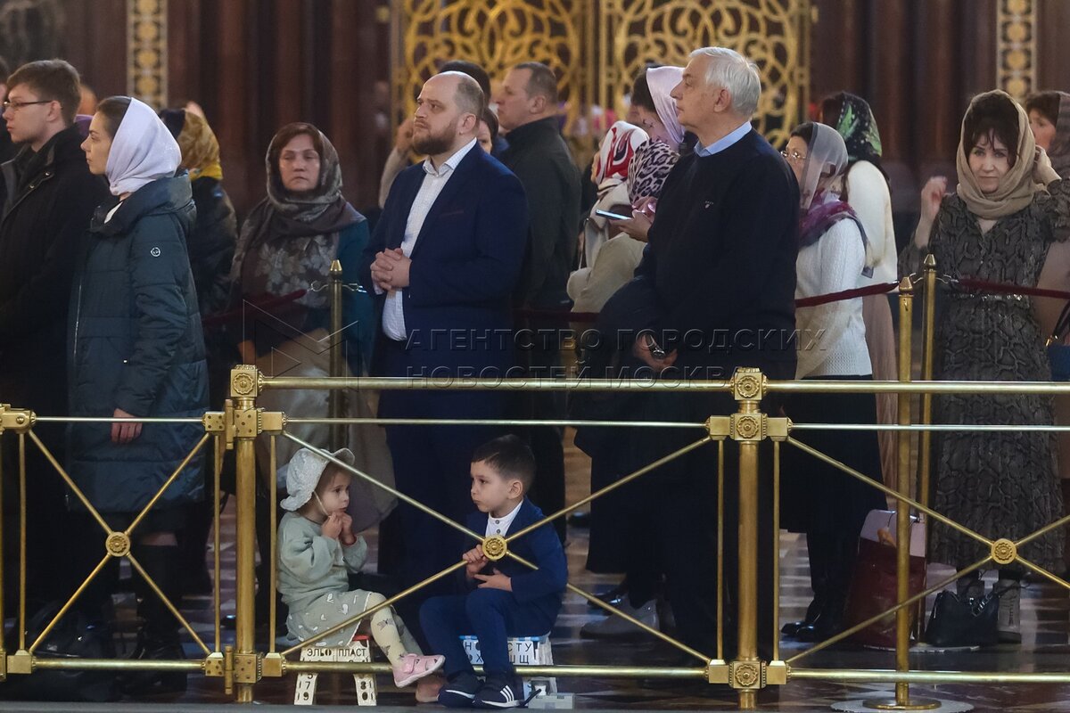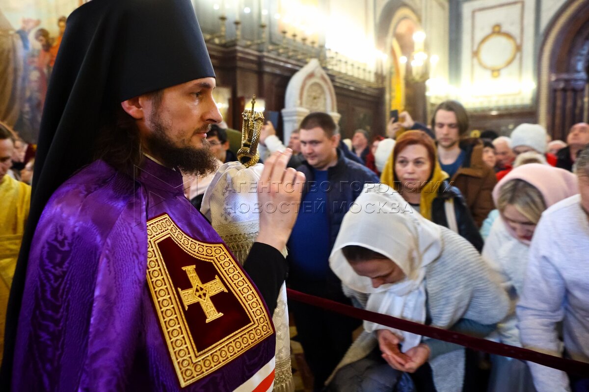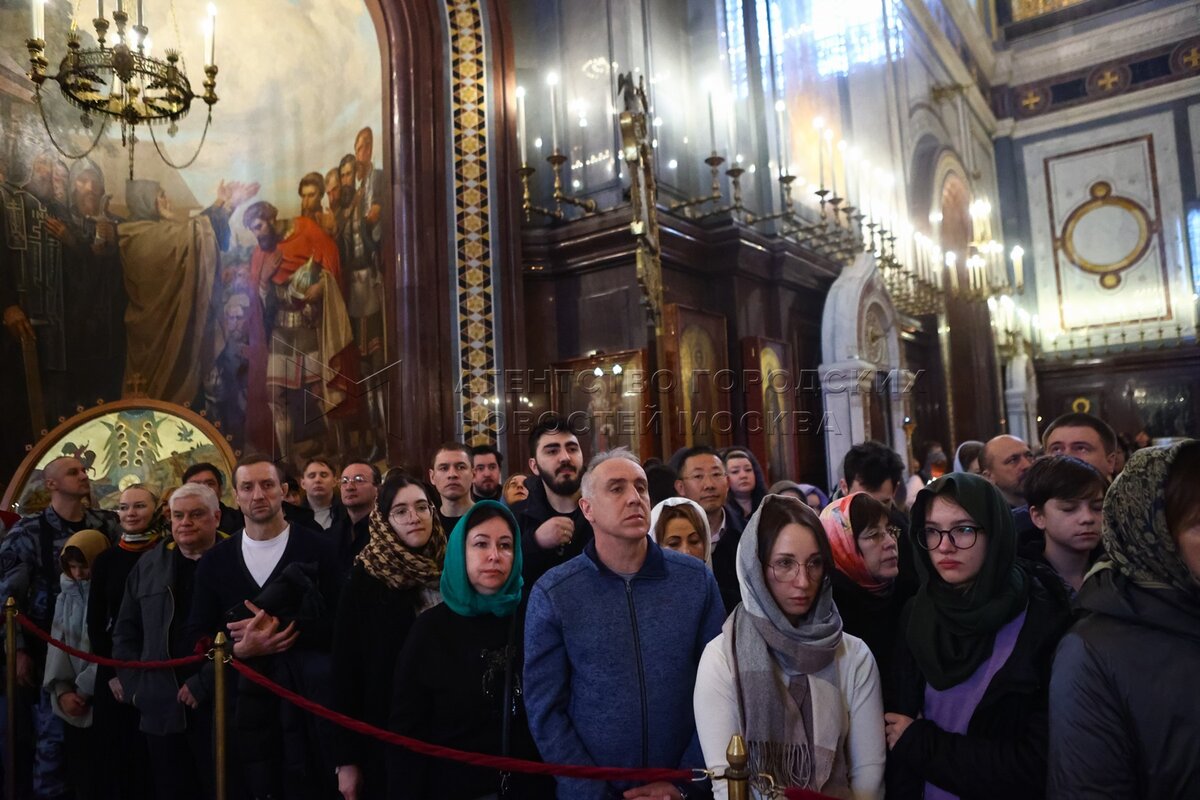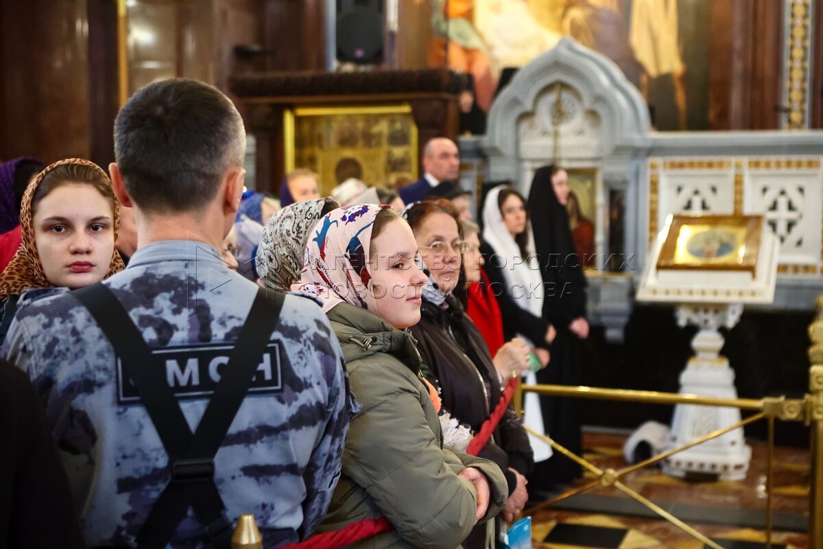 Верующие во время богослужения в праздник Торжества православия 24 марта 2024 год...