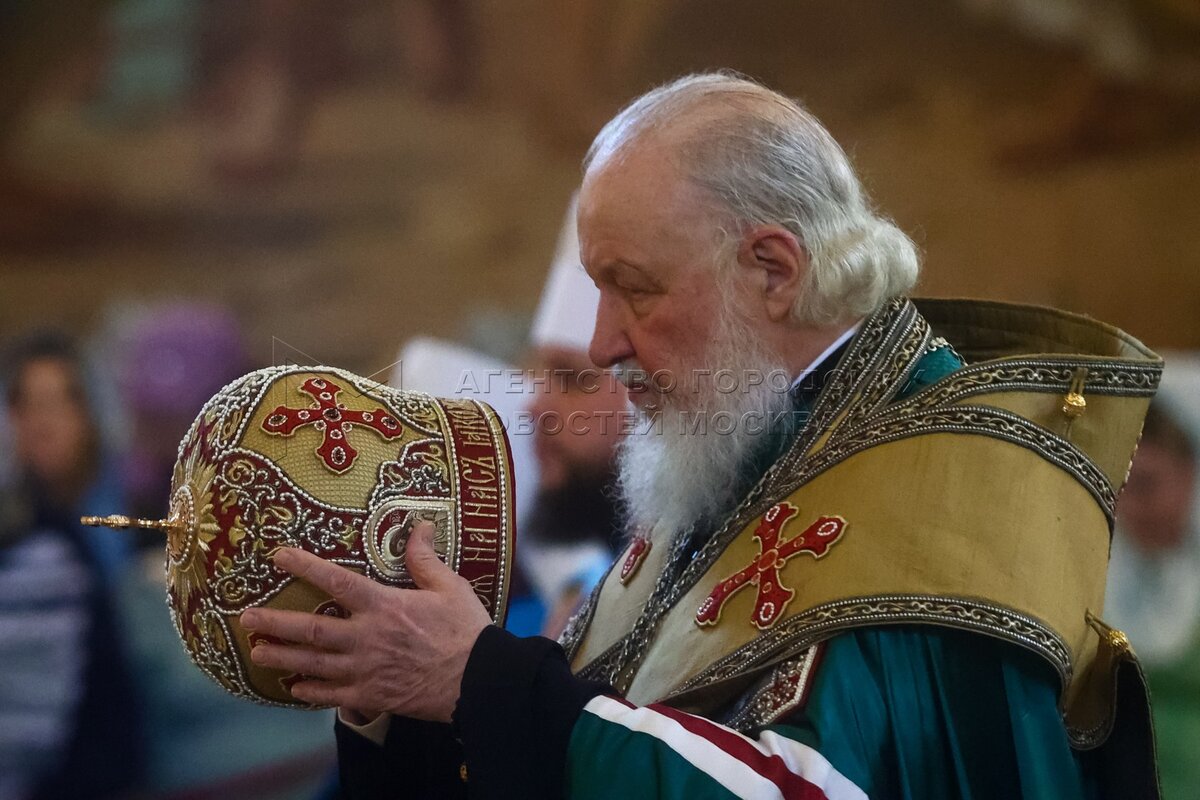 Патриарх Московский и всея Руси Кирилл во время богослужения в праздник Торжества...