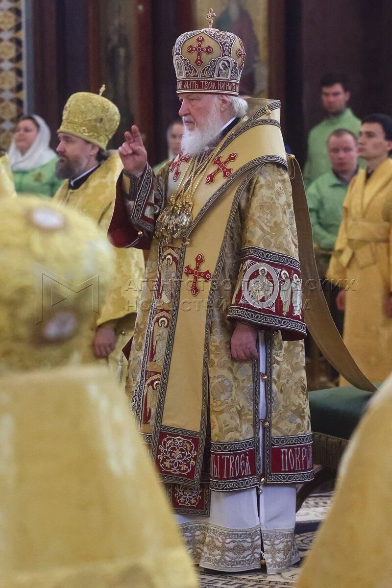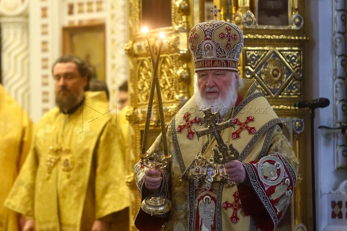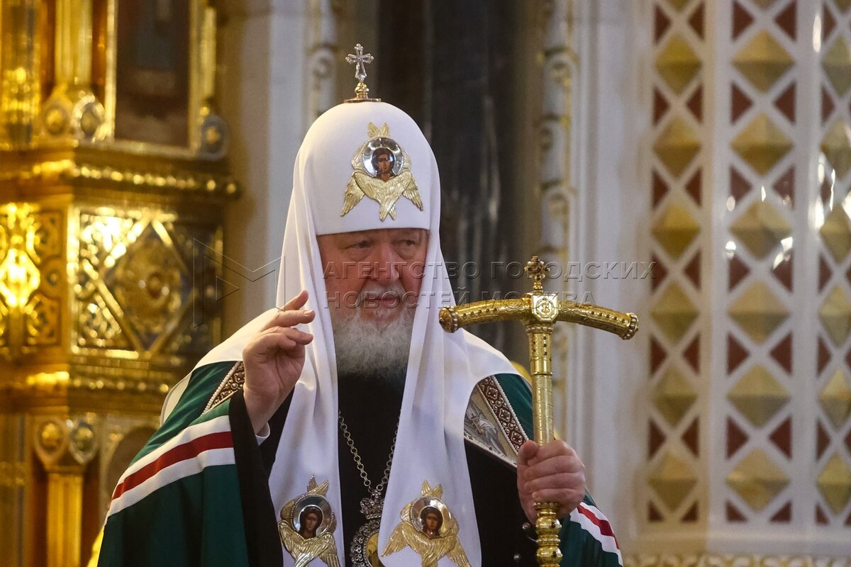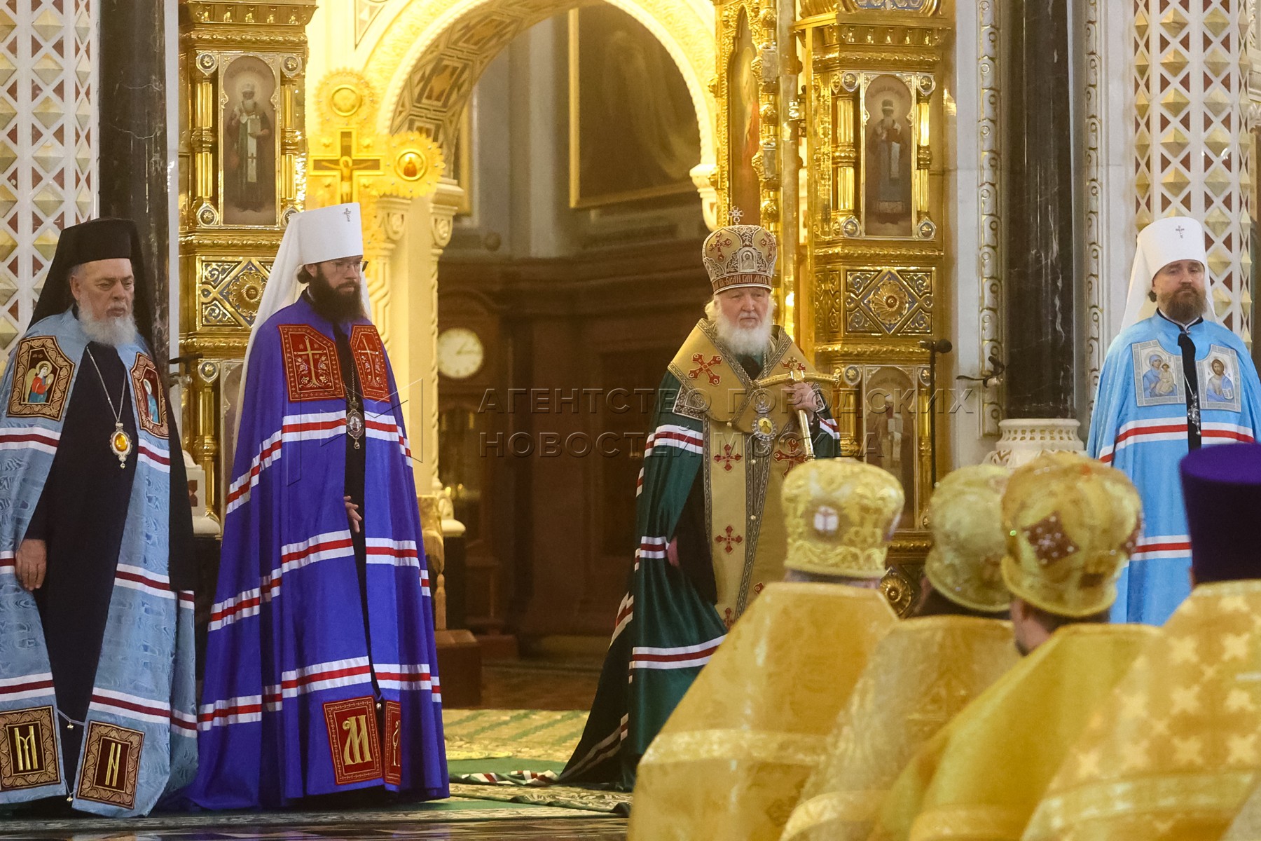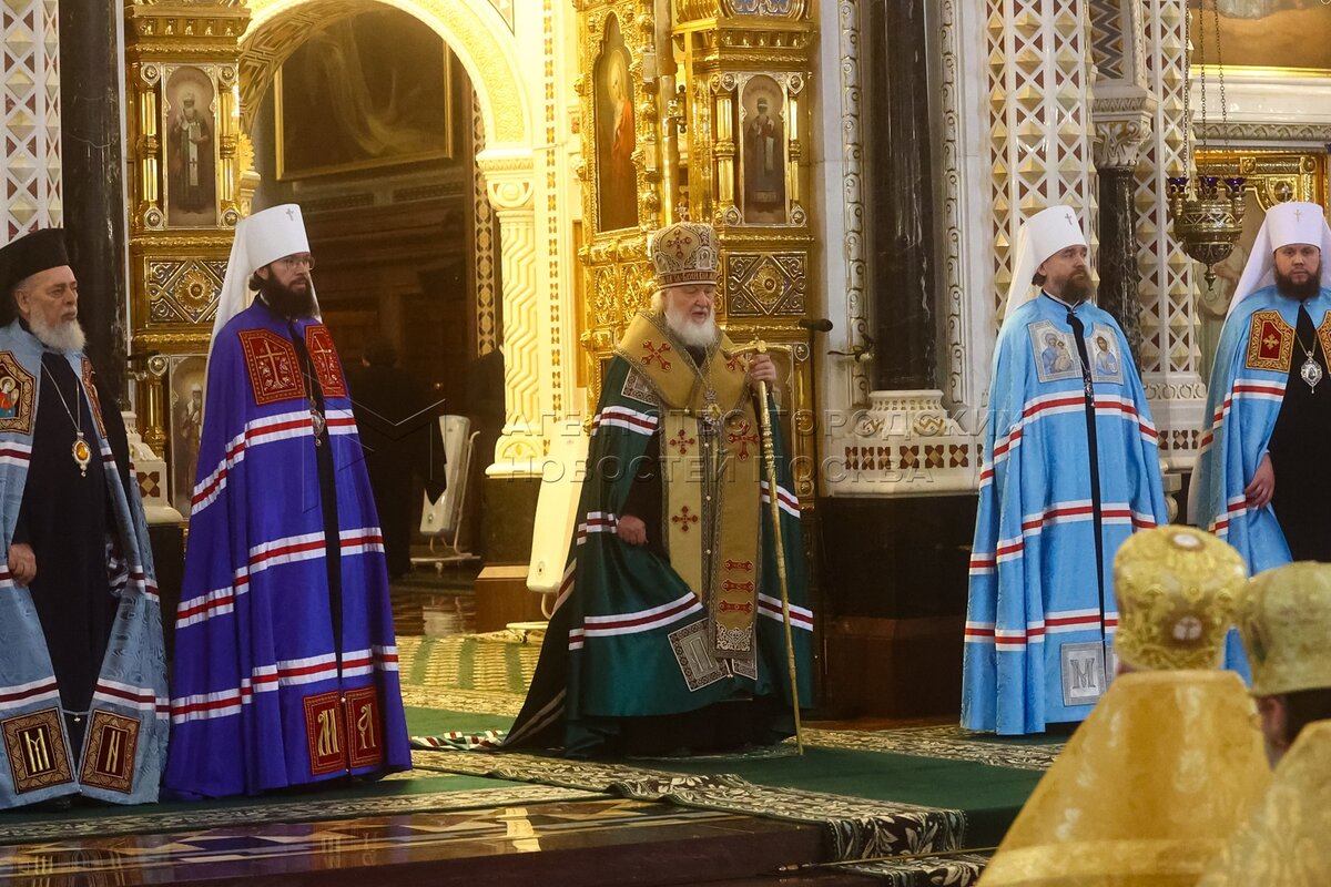 Патриарх Московский и всея Руси Кирилл (в центре) во время богослужения в праздни...