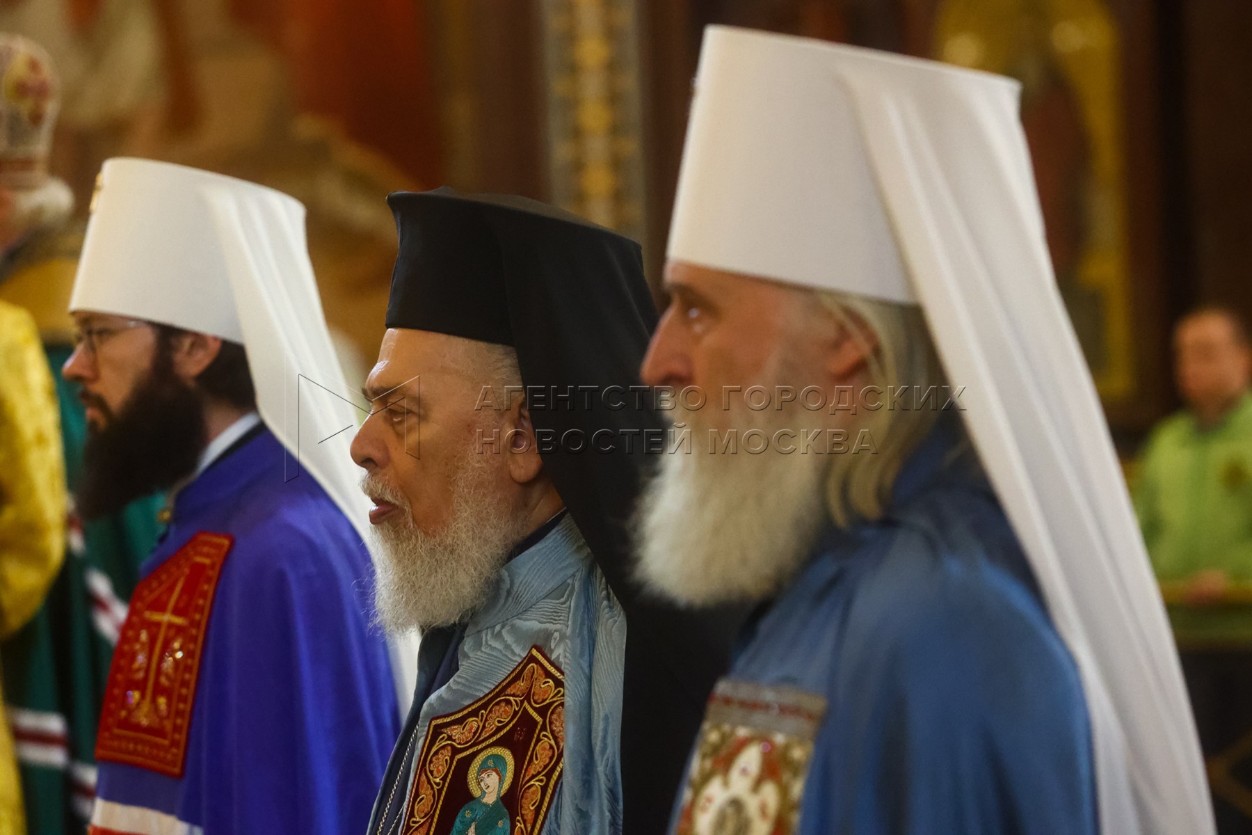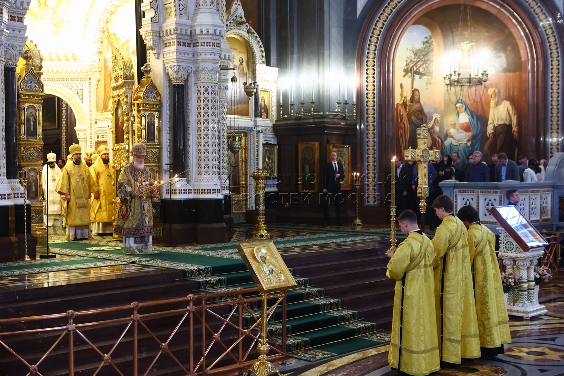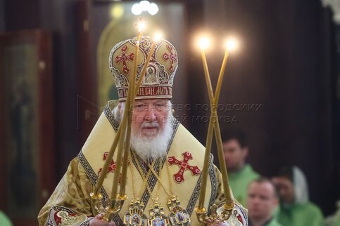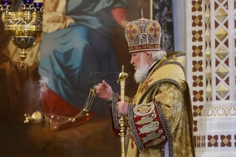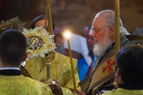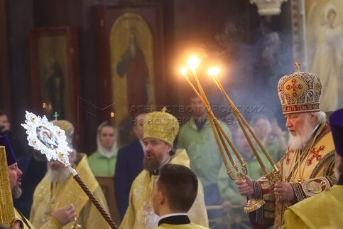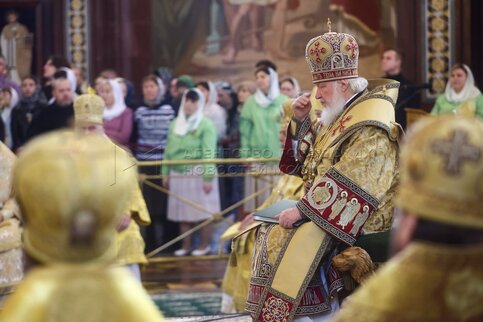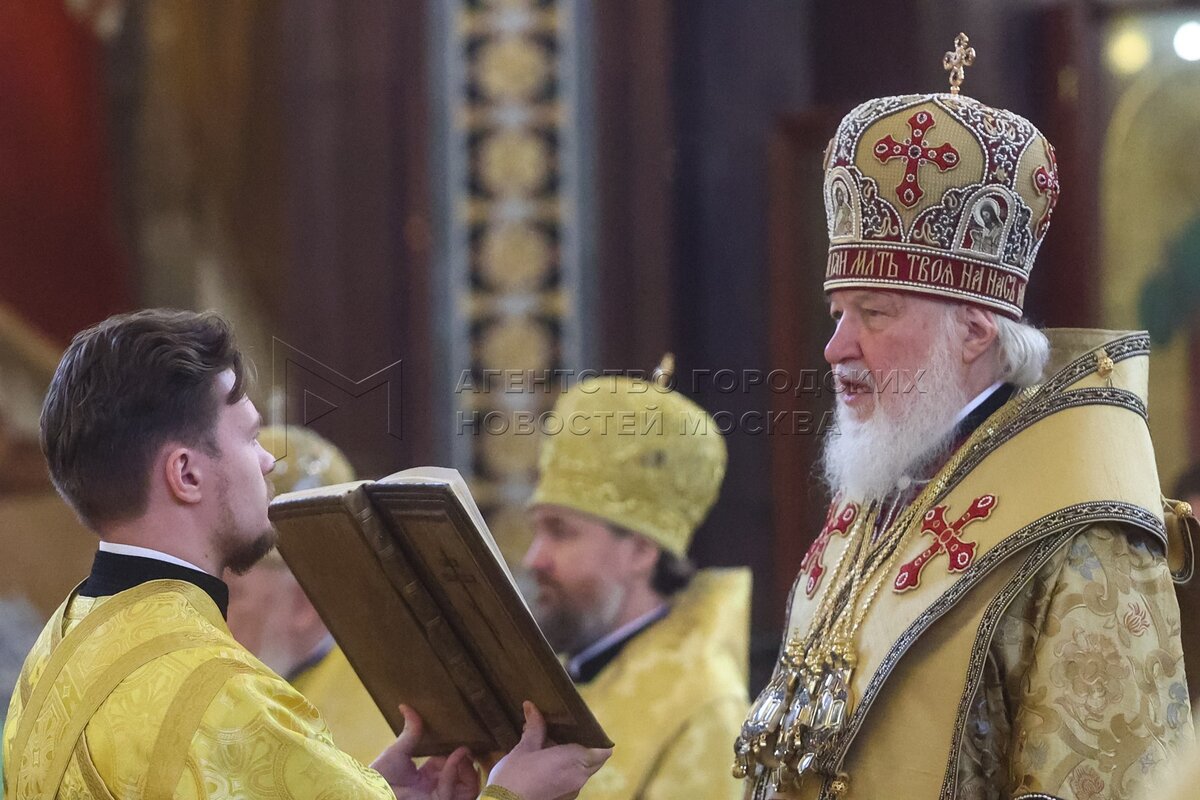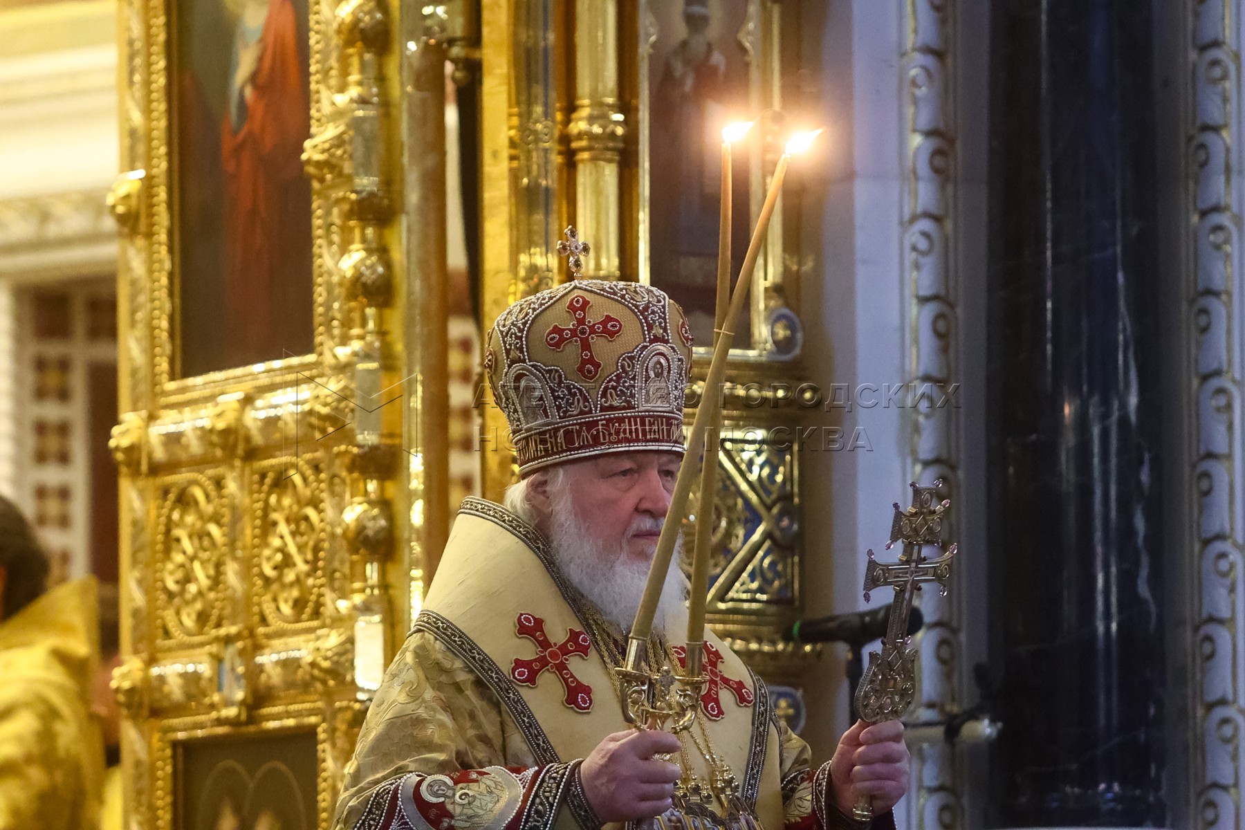 Патриарх Московский и всея Руси Кирилл (в центре) во время богослужения в праздни...
