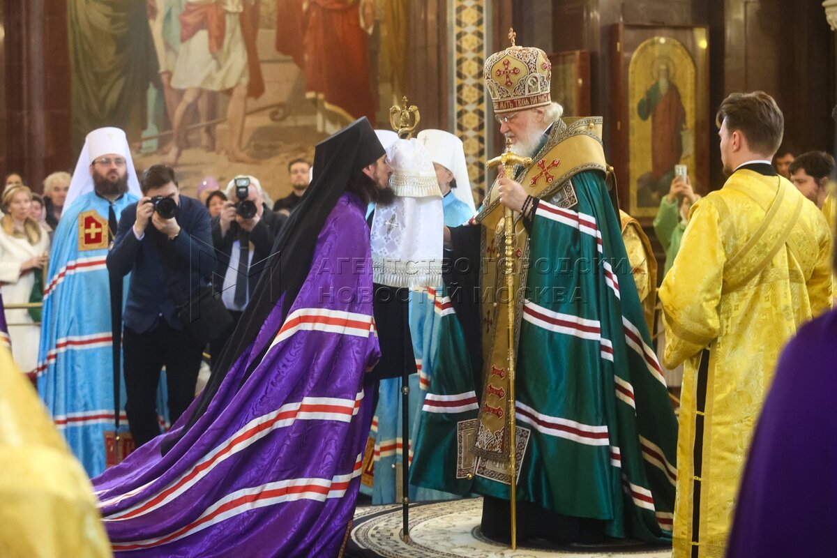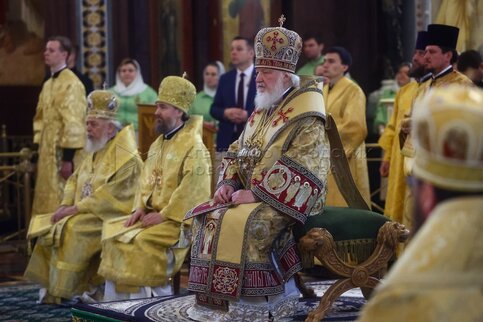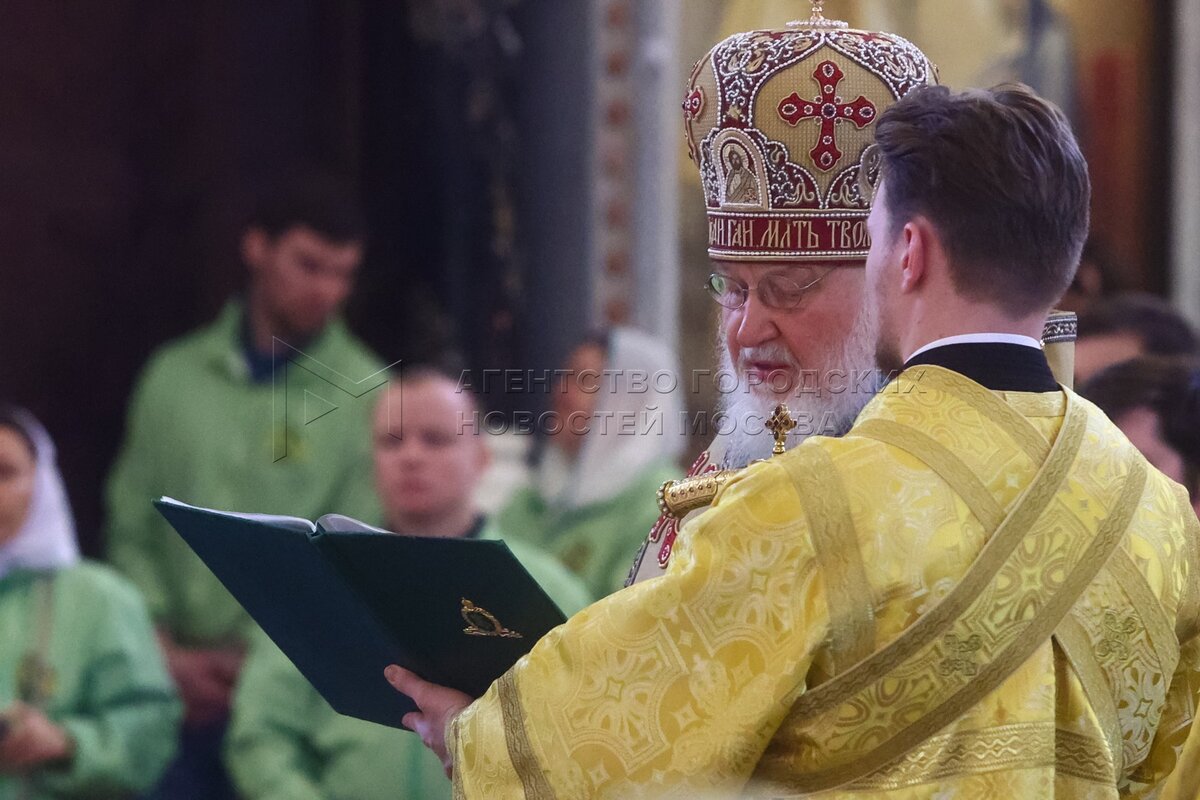 Патриарх Московский и всея Руси Кирилл (справа) во время богослужения в праздник ...