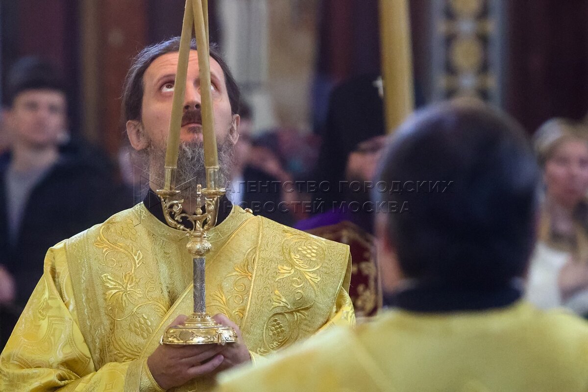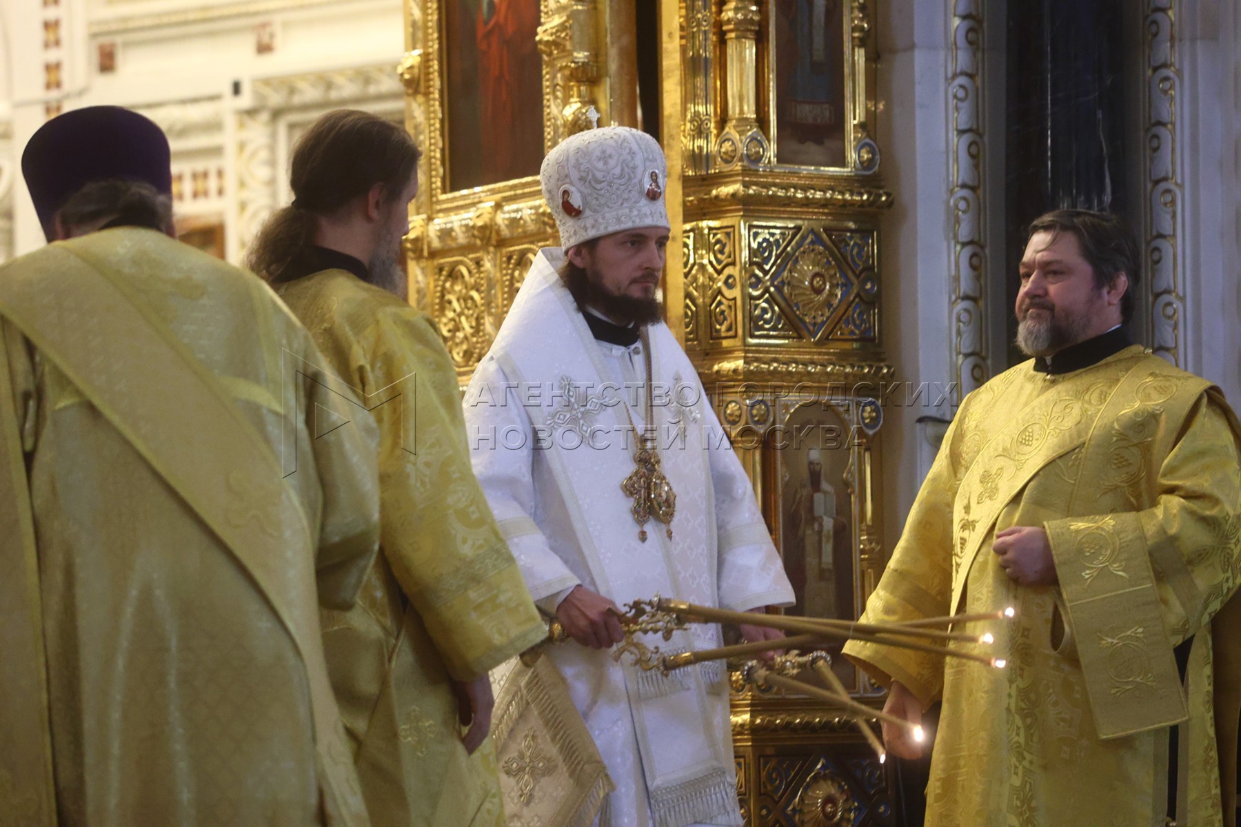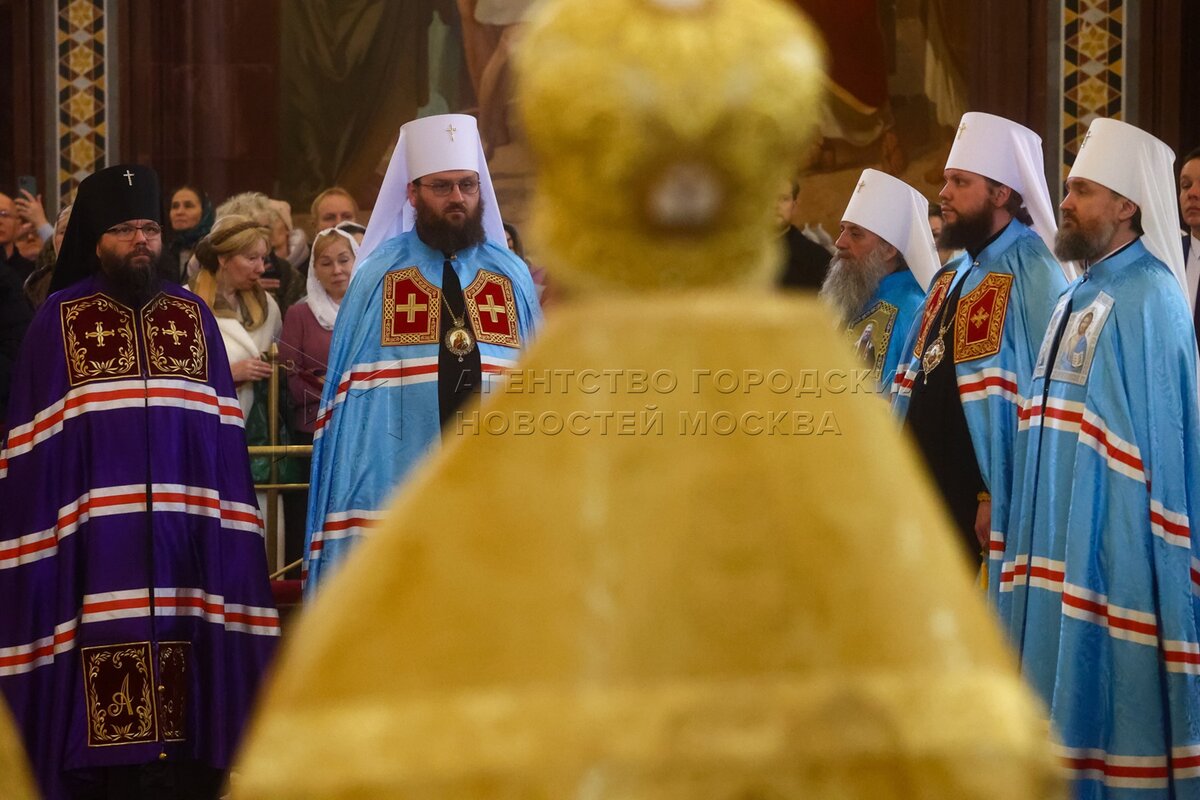 Священнослужители во время богослужения в праздник Торжества православия 24 марта...
