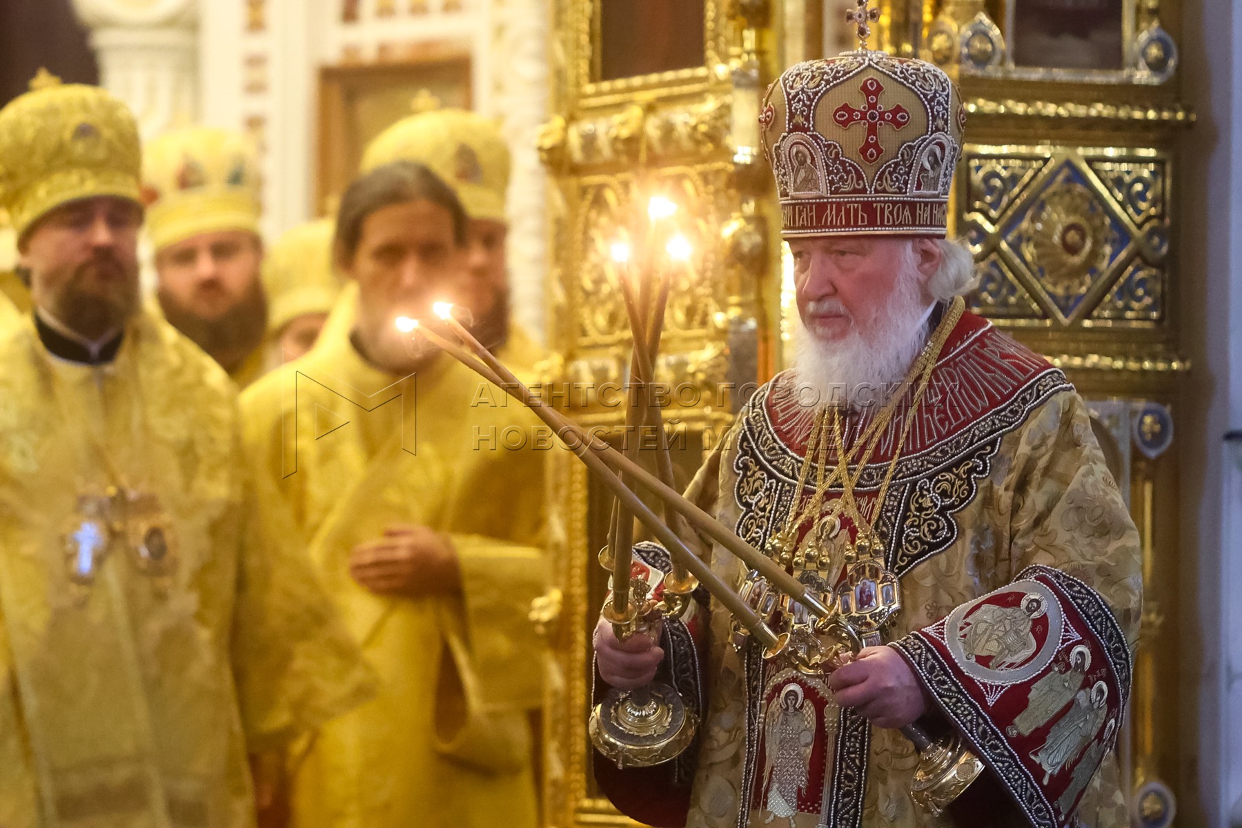 Патриарх Московский и всея Руси Кирилл (в центре) во время богослужения в праздни...