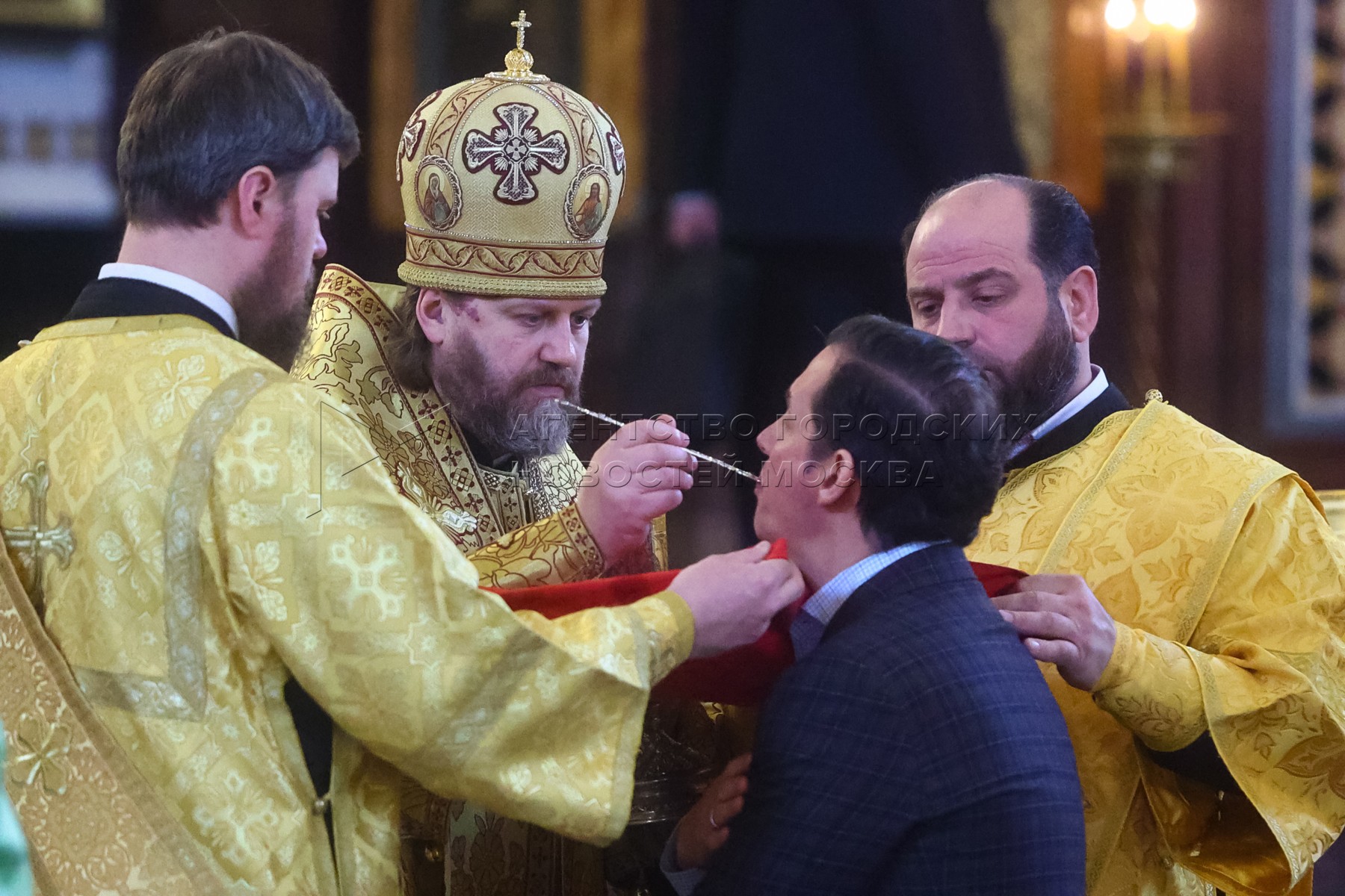 • Описание: Причащение во время богослужения в праздник Торжества православия 24 марта 2024 года в кафедральном соборном храме Христа Спасителя.