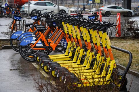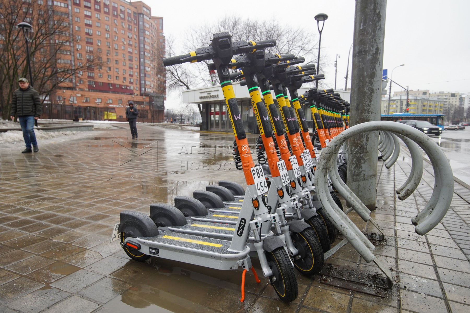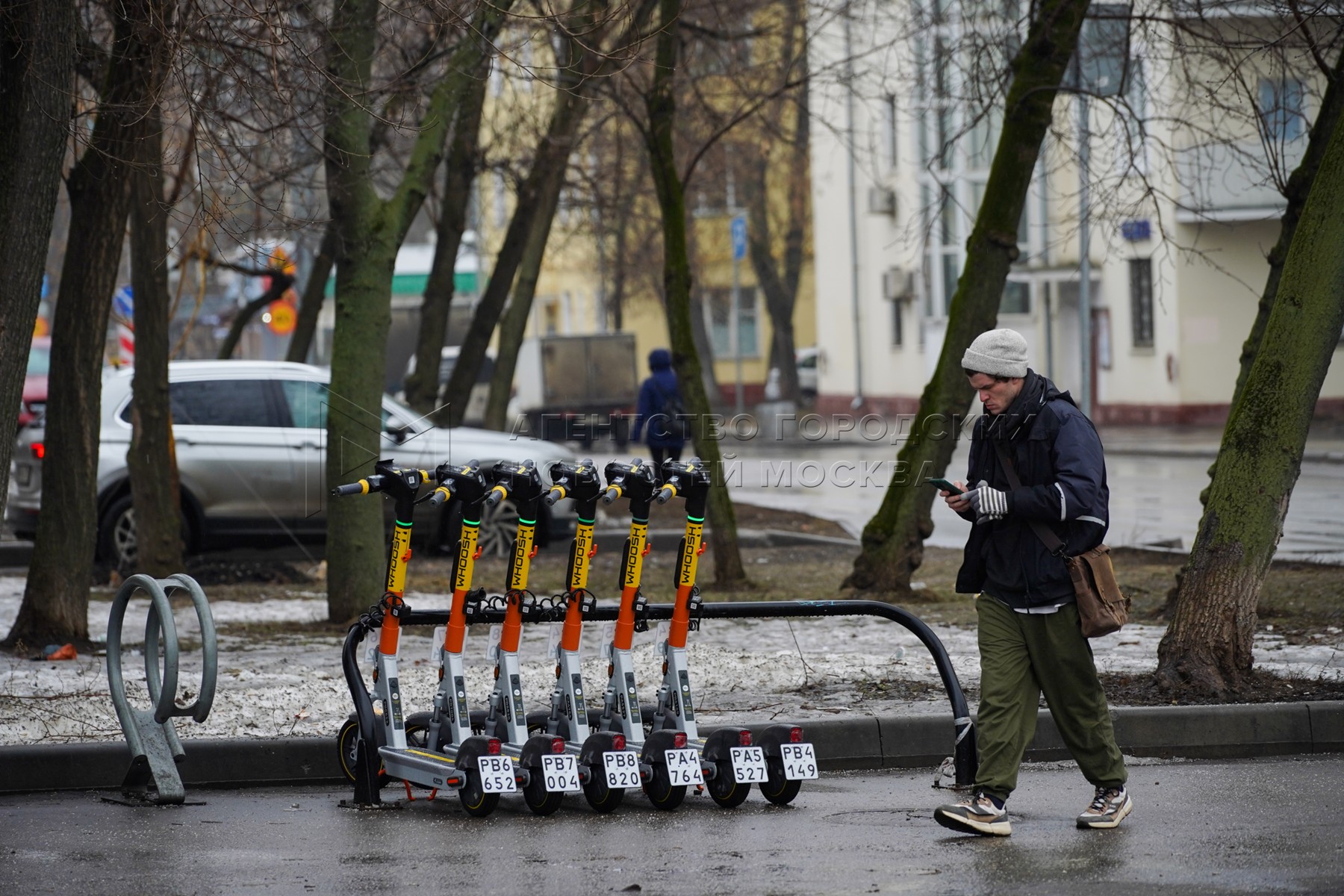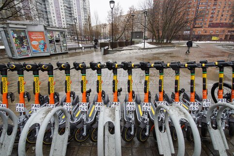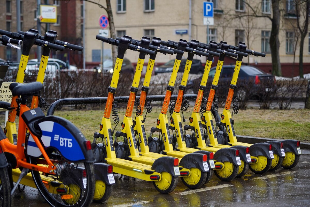 Самокаты сервиса кикшеринга «Яндекс Go» на улицах Москвы.