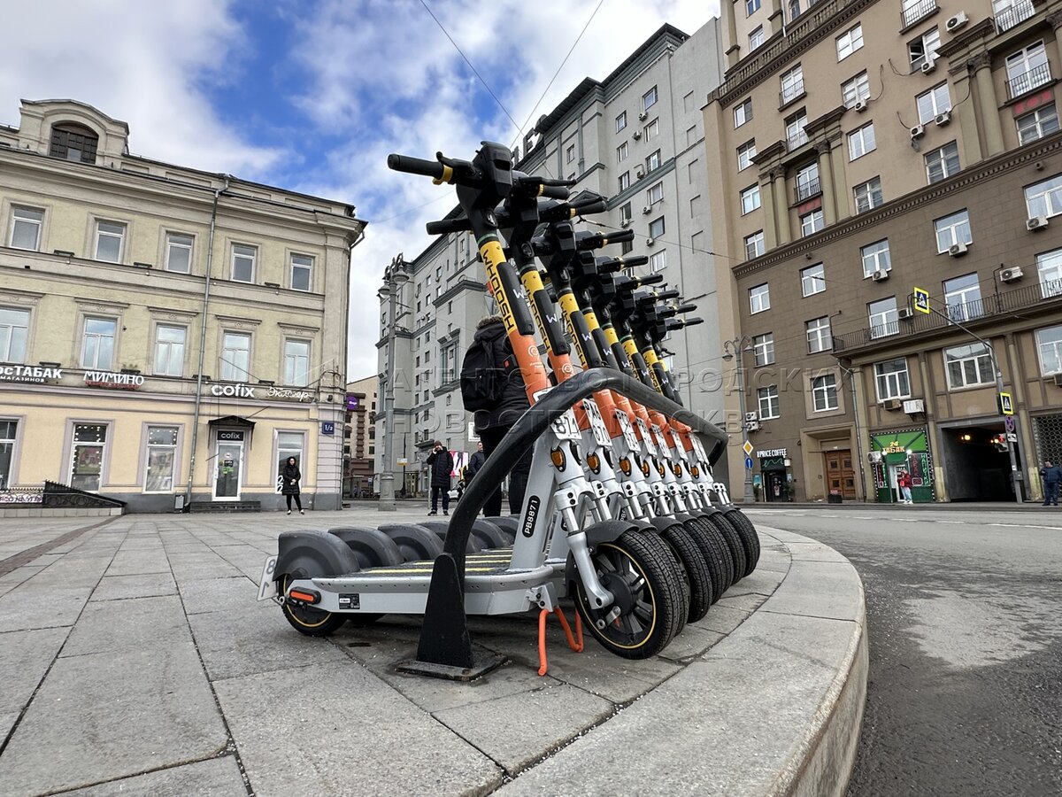 Самокаты сервиса кикшеринга «МТС Юрент» на улицах Москвы.