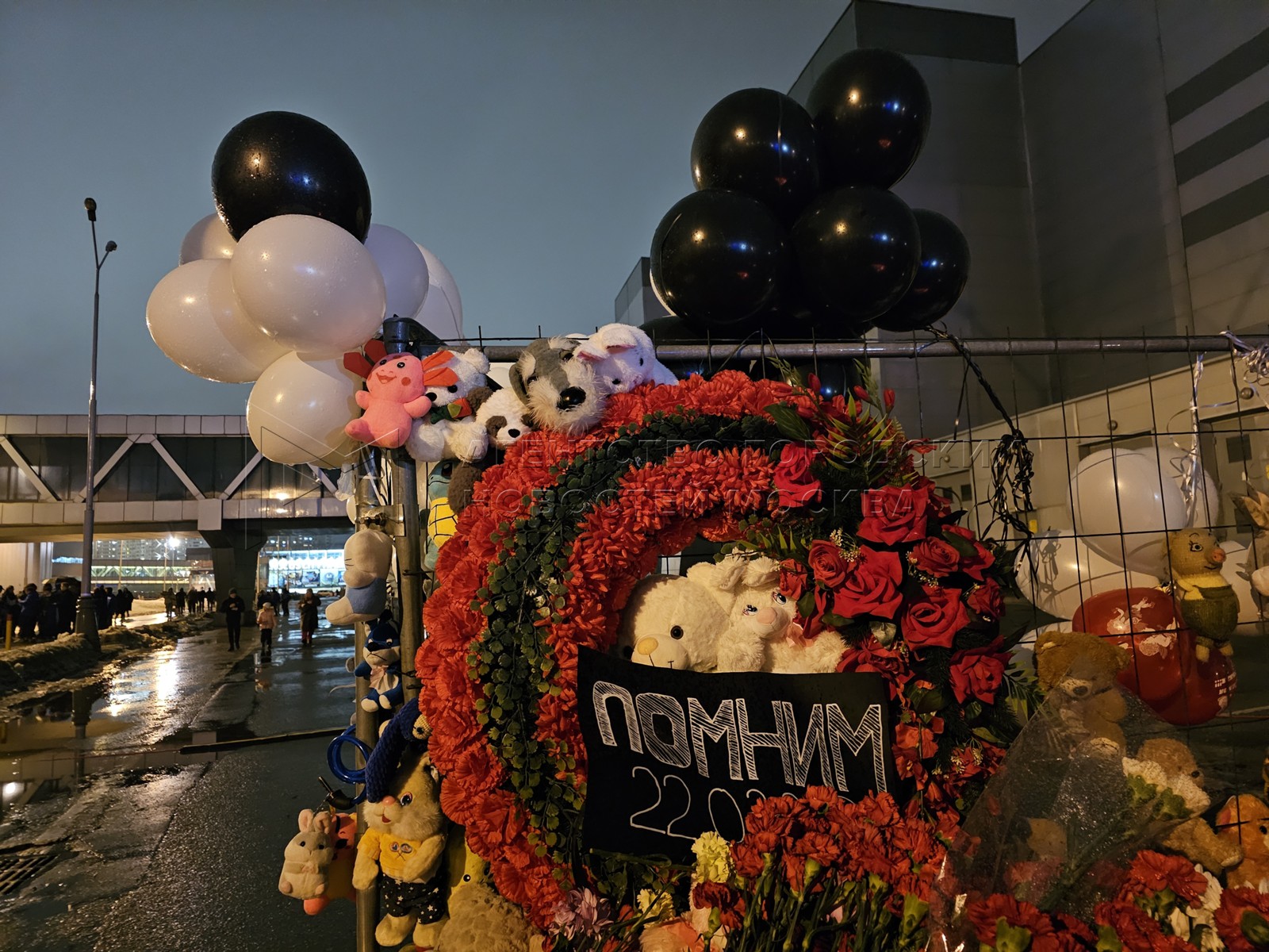 • Описание: Цветы, свечи и мягкие игрушки в память о жертвах теракта в подмосковном Crocus City Hall.