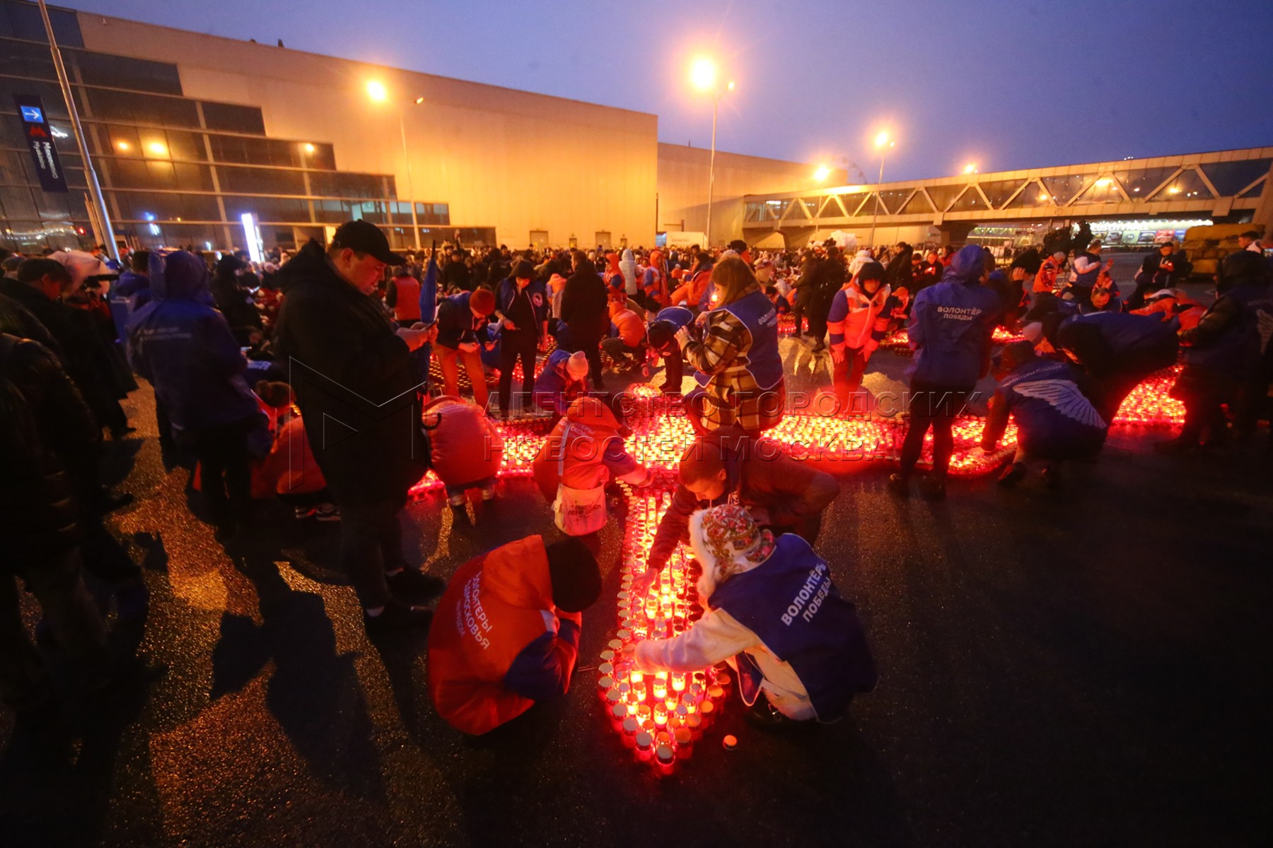 Свечи памяти на стихийном мемориале у здания Crocus City Hall в память о жертвах ...